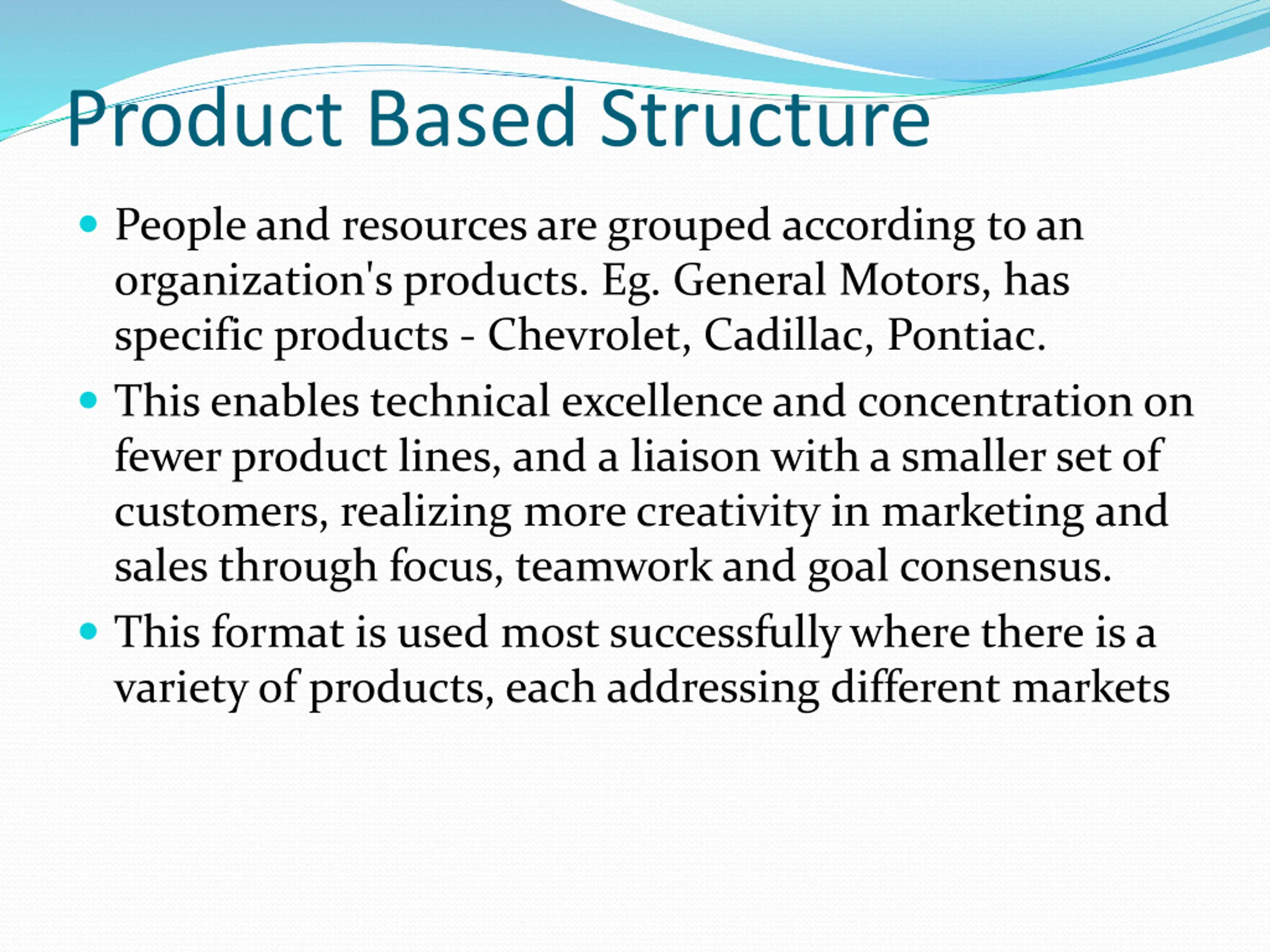 Product Based Structure People and resources are grouped according to an organization's products. Eg. General Motors, has specific products - Chevrolet, Cadillac, Pontiac. This enables technical excellence and concentration on fewer product lines, and a liaison with a smaller set of customers, realizing more creativity in marketing and sales through focus, teamwork and goal consensus. This format is used most successfully where there is a variety of products, each addressing different markets