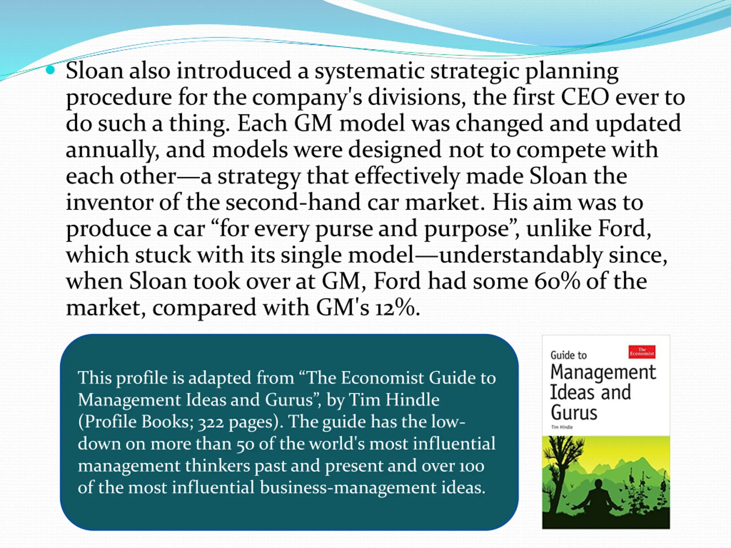 Sloan also introduced a systematic strategic planning procedure for the company's divisions, the first CEO ever to do such a thing. Each GM model was changed and updated annually, and models were designed not to compete with each other a strategy that effectively made Sloan the inventor of the second-hand car market. His aim was to produce a car for every purse and purpose , unlike Ford, which stuck with its single model understandably since, when Sloan took over at GM, Ford had some 60% of the market, compared with GM's 12%. This profile is adapted from The Economist Guide to Management Ideas and Gurus , by Tim Hindle (Profile Books; 322 pages). The guide has the low- down on more than 50 of the world's most influential management thinkers past and present and over 100 of the most influential business-management ideas.