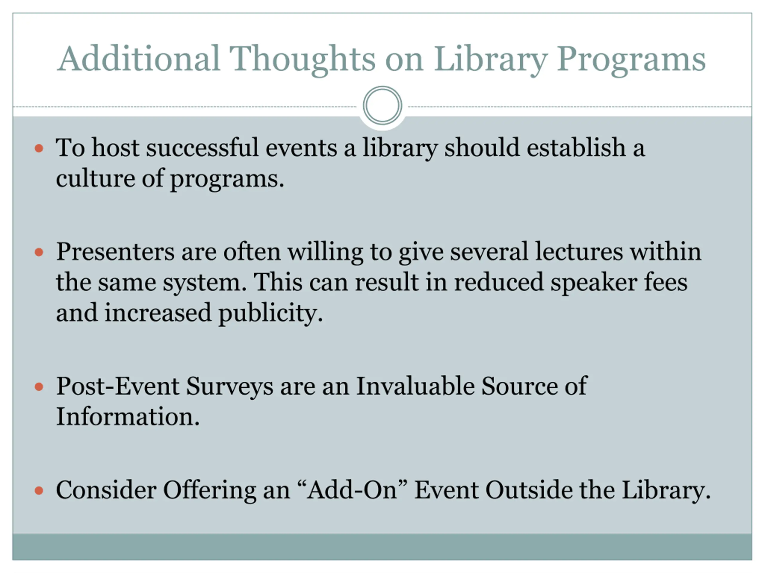 Additional Thoughts on Library Programs To host successful events a library should establish a culture of programs. Presenters are often willing to give several lectures within the same system. This can result in reduced speaker fees and increased publicity. Post-Event Surveys are an Invaluable Source of Information. Consider Offering an Add-On Event Outside the Library.