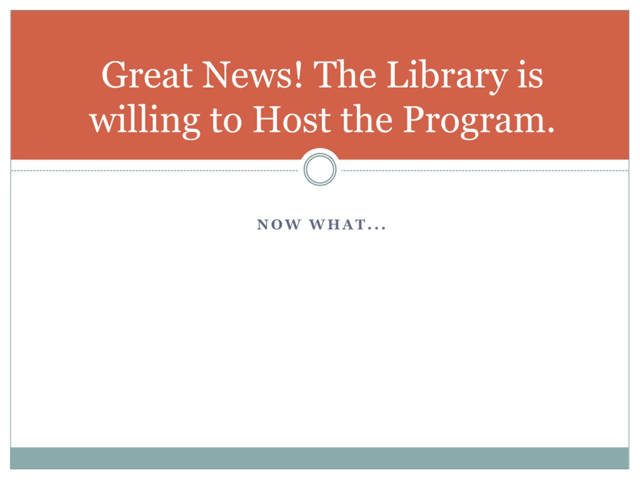 Great News! The Library is willing to Host the Program. NOW WHAT...