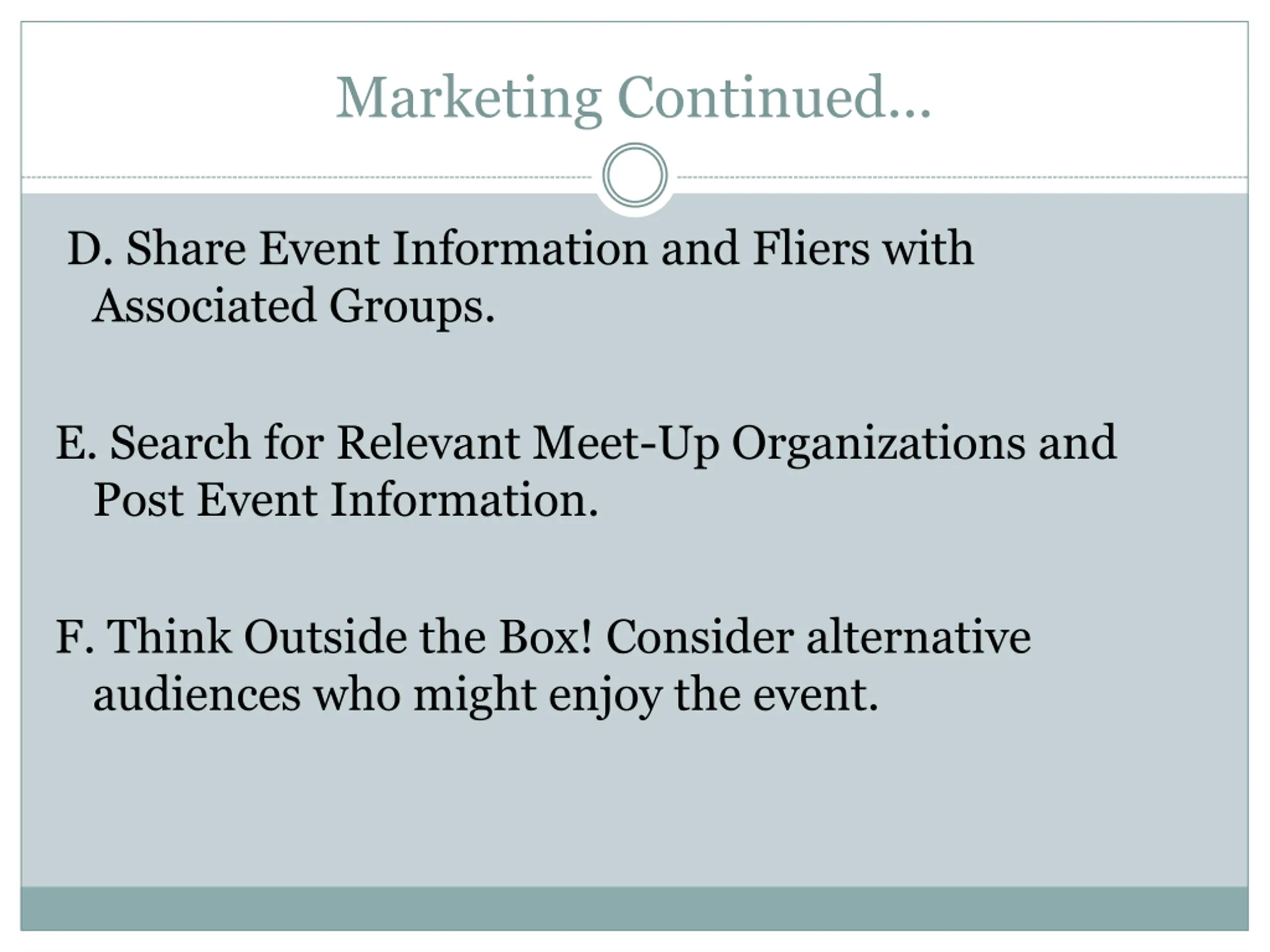 Marketing Continued... D. Share Event Information and Fliers with Associated Groups. E. Search for Relevant Meet-Up Organizations and Post Event Information. F. Think Outside the Box! Consider alternative audiences who might enjoy the event.