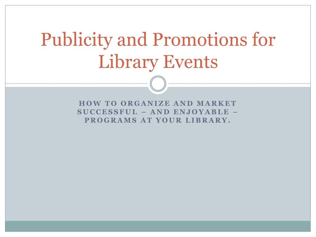 Publicity and Promotions for Library Events HOW TO ORGANIZE AND MARKET SUCCESSFUL AND ENJOYABLE PROGRAMS AT YOUR LIBRARY.