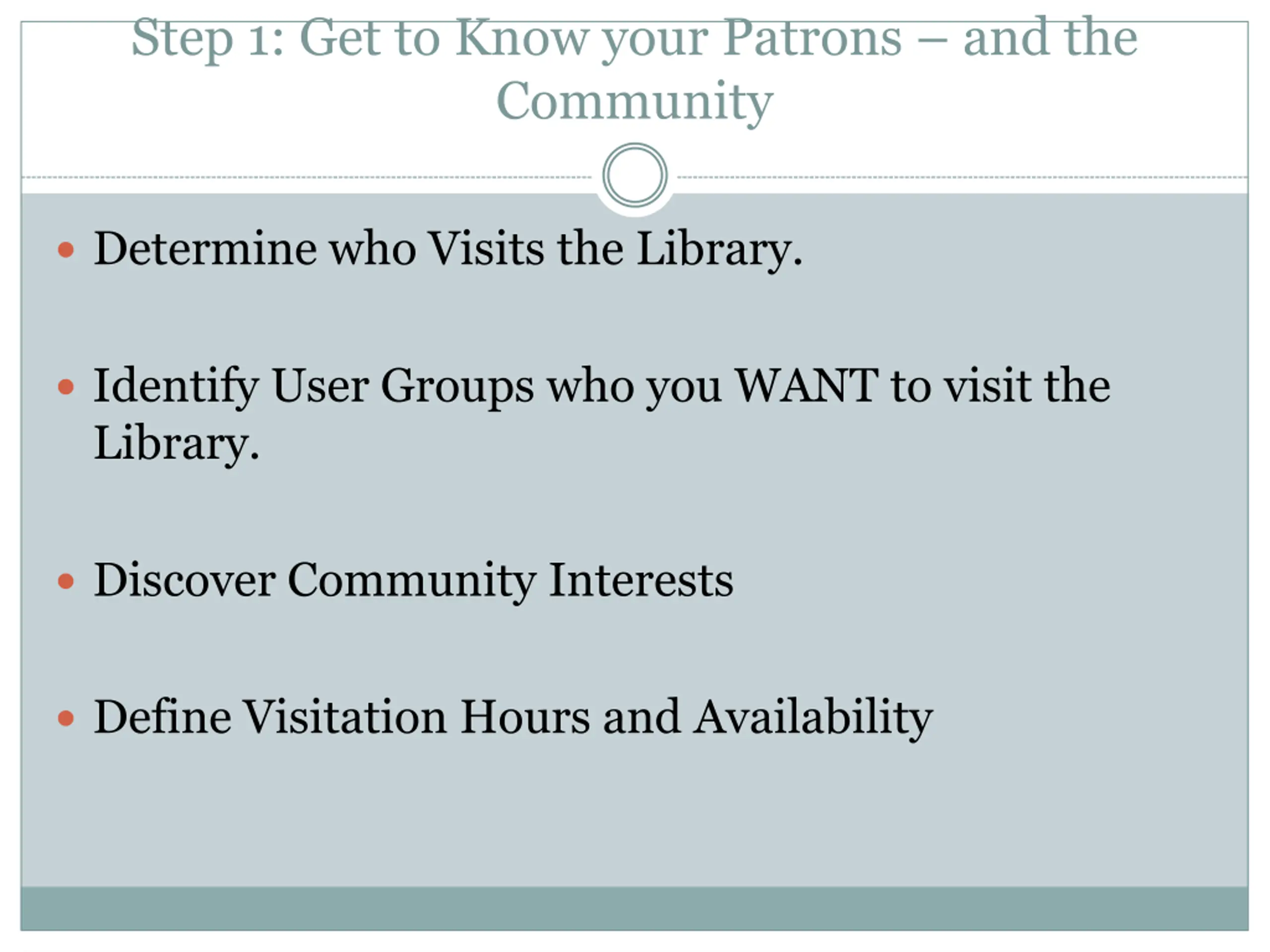 Step 1: Get to Know your Patrons and the Community Determine who Visits the Library. Identify User Groups who you WANT to visit the Library. Discover Community Interests Define Visitation Hours and Availability