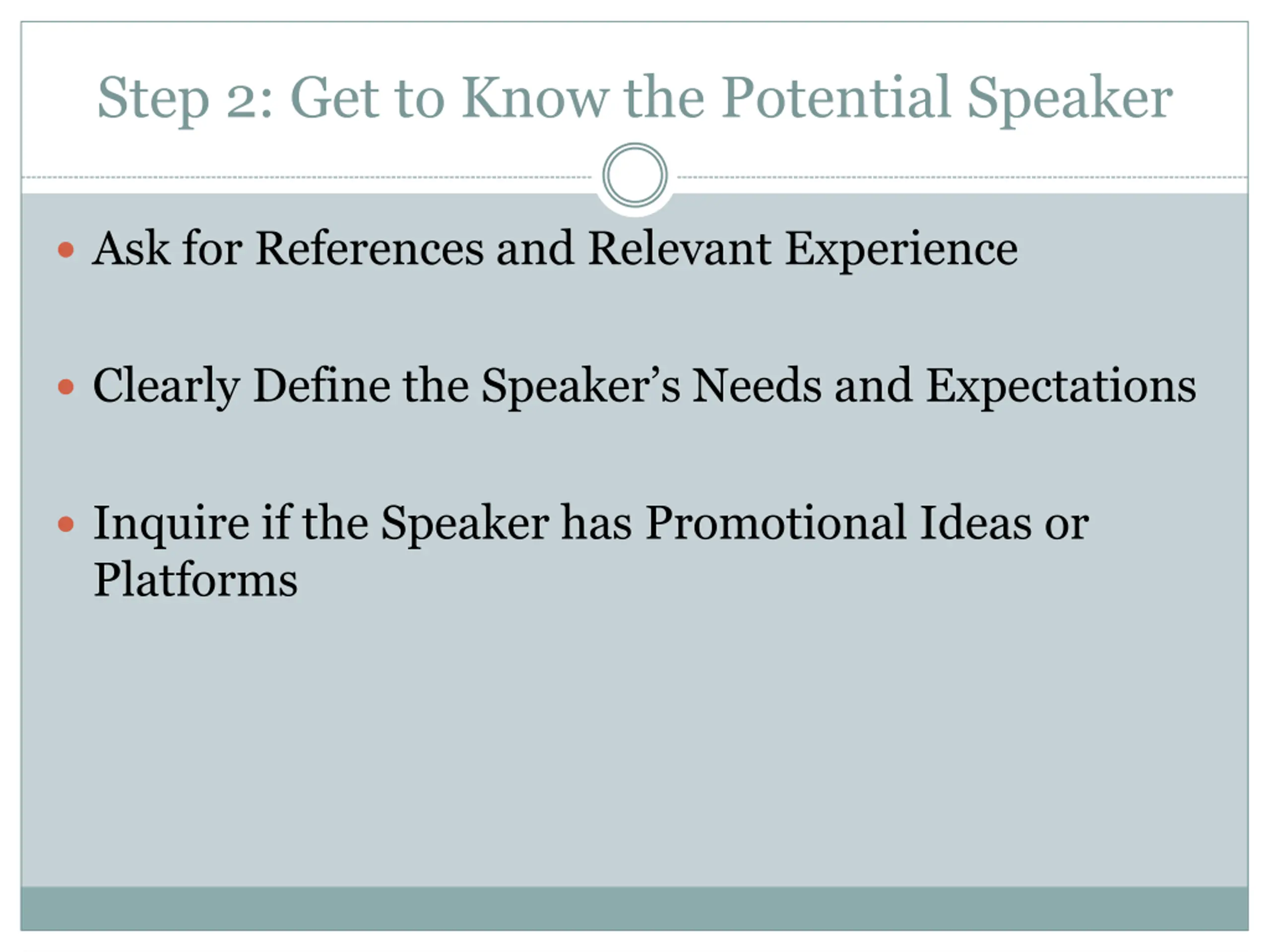 Step 2: Get to Know the Potential Speaker Ask for References and Relevant Experience Clearly Define the Speaker s Needs and Expectations Inquire if the Speaker has Promotional Ideas or Platforms