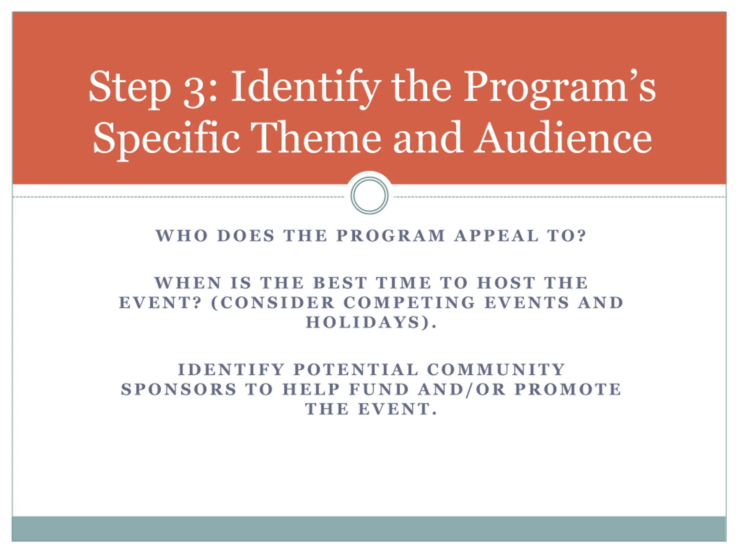 Step 3: Identify the Programs Specific Theme and Audience WHO DOES THE PROGRAM APPEAL TO? WHEN IS THE BEST TIME TO HOST THE EVENT? (CONSIDER COMPETING EVENTS AND HOLIDAYS). IDENTIFY POTENTIAL COMMUNITY SPONSORS TO HELP FUND AND/OR PROMOTE THE EVENT.
