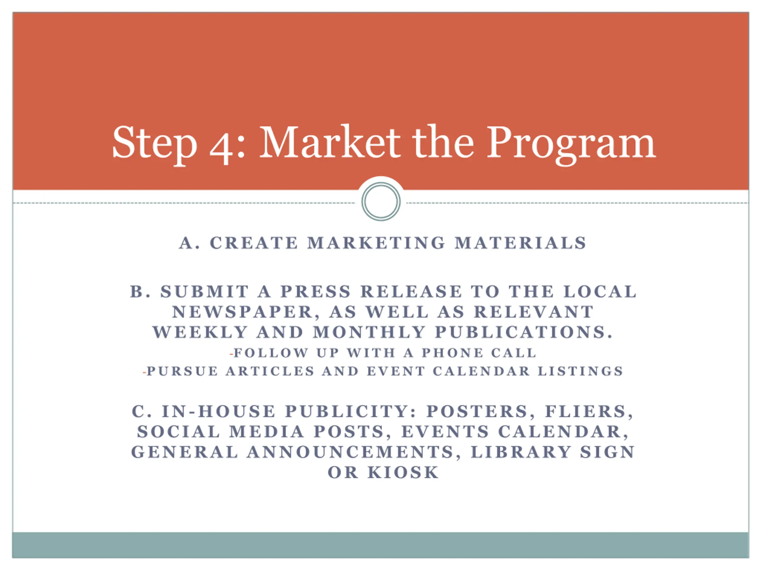 Step 4: Market the Program A. CREATE MARKETING MATERIALS B. SUBMIT A PRESS RELEASE TO THE LOCAL NEWSPAPER, AS WELL AS RELEVANT WEEKLY AND MONTHLY PUBLICATIONS. -F O L L O W U P W I T H A P H O N E C A L L -P U R S U E A R T I C L E S A N D E V E N T C A L E N D A R L I S T I N G S C. IN-HOUSE PUBLICITY: POSTERS, FLIERS, SOCIAL MEDIA POSTS, EVENTS CALENDAR, GENERAL ANNOUNCEMENTS, LIBRARY SIGN OR KIOSK