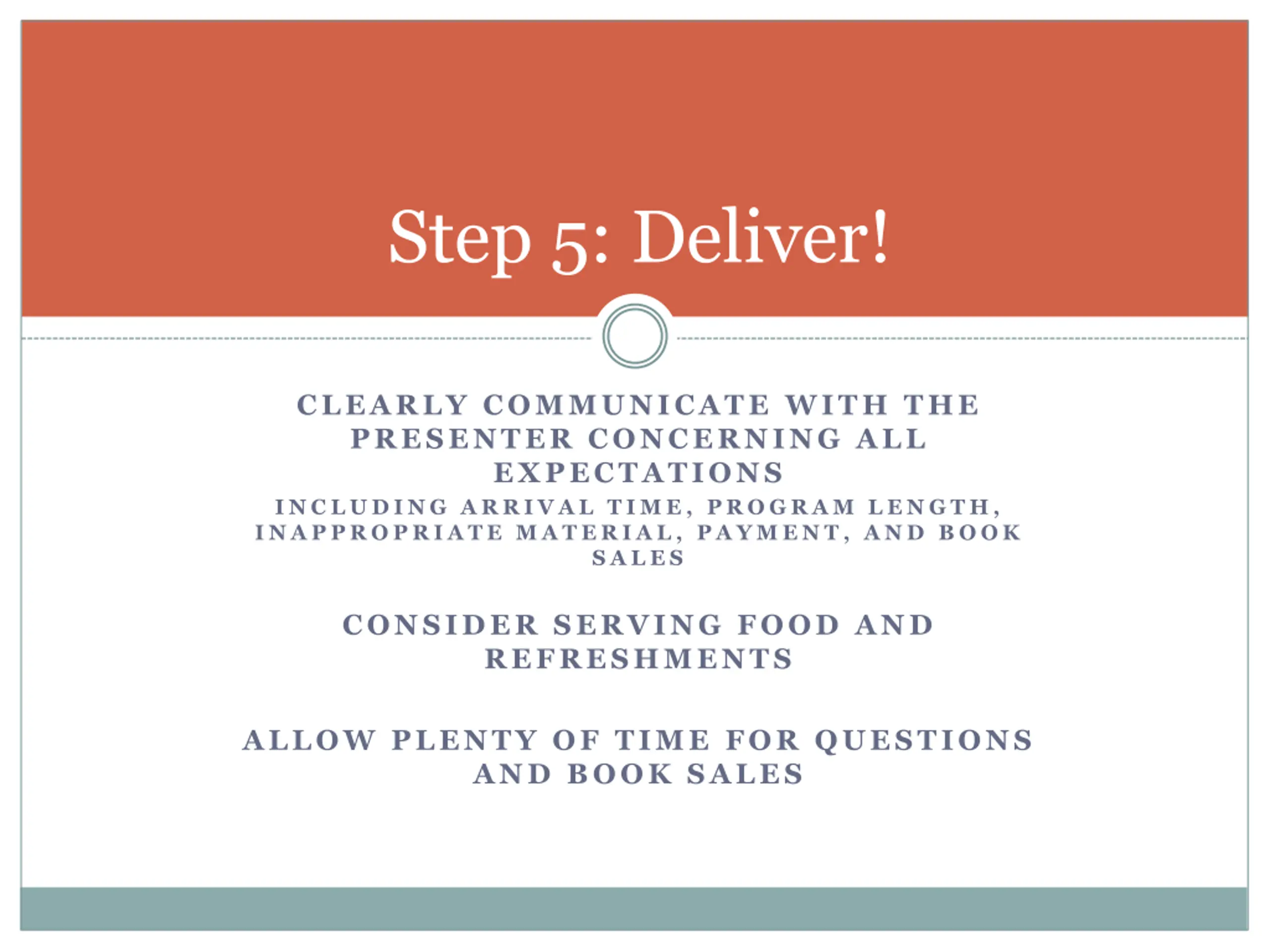 Step 5: Deliver! CLEARLY COMMUNICATE WITH THE PRESENTER CONCERNING ALL EXPECTATIONS I N C L U D I N G A R R I V A L T I M E , P R O G R A M L E N G T H , I N A P P R O P R I A T E M A T E R I A L , P A Y M E N T , A N D B O O K S A L E S CONSIDER SERVING FOOD AND REFRESHMENTS ALLOW PLENTY OF TIME FOR QUESTIONS AND BOOK SALES