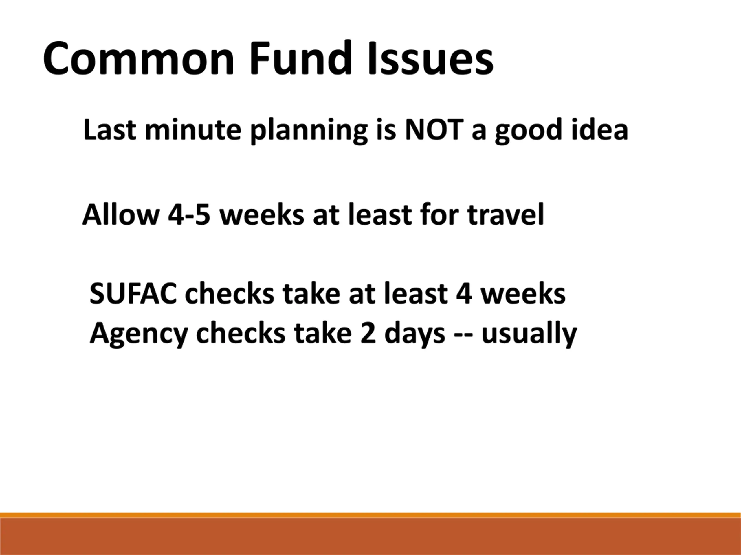 Common Fund Issues Last minute planning is NOT a good idea Allow 4-5 weeks at least for travel SUFAC checks take at least 4 weeks Agency checks take 2 days -- usually