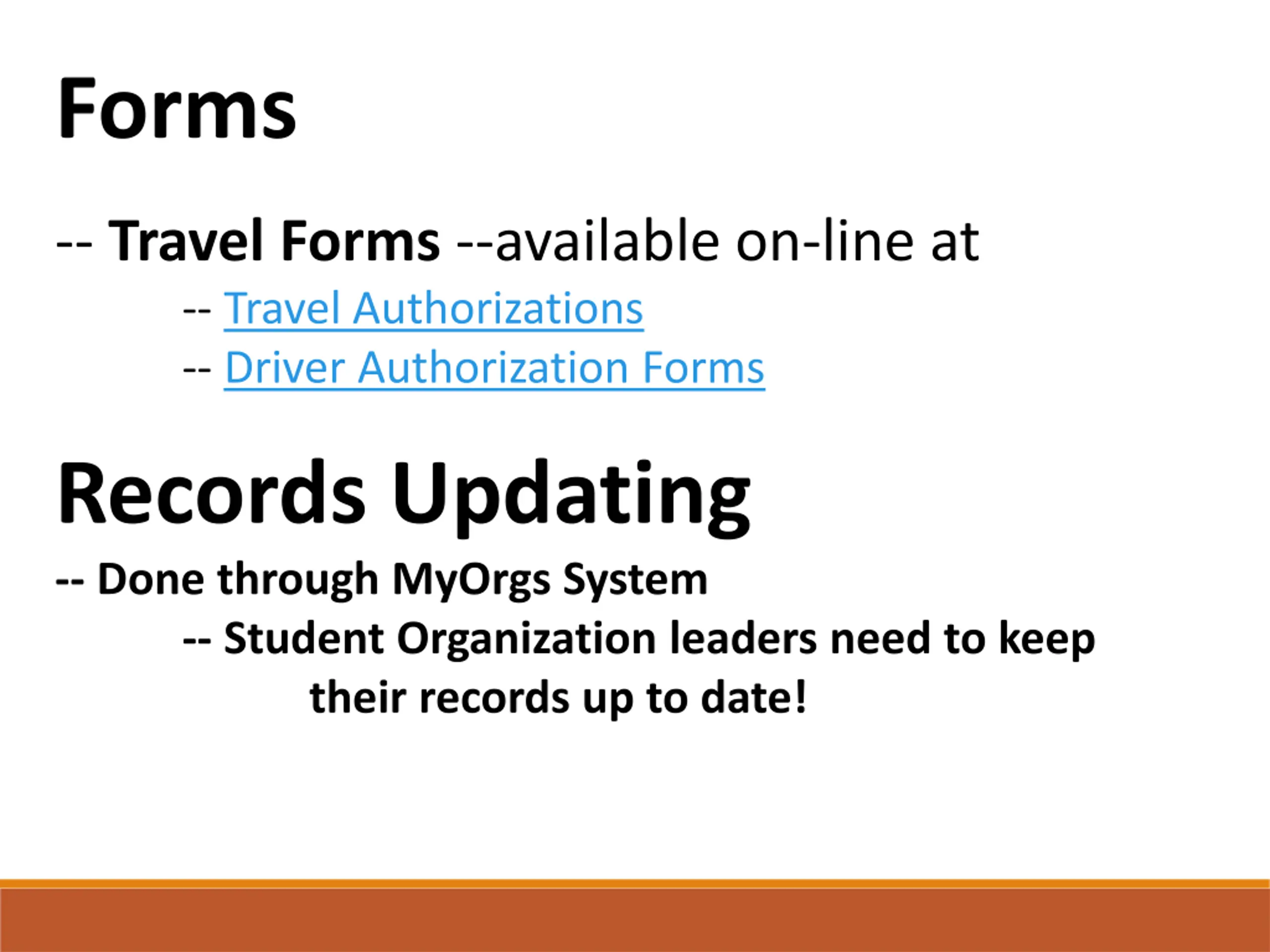 Forms -- Travel Forms --available on-line at -- Travel Authorizations -- Driver Authorization Forms Records Updating -- Done through MyOrgs System -- Student Organization leaders need to keep their records up to date!