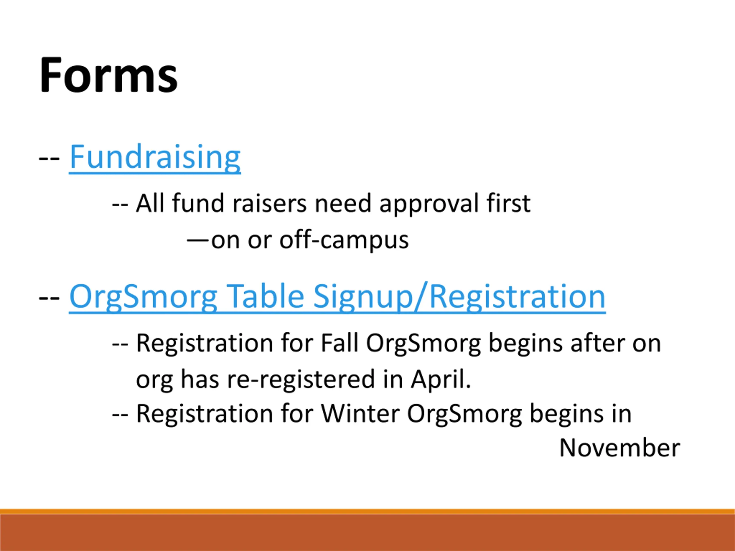 Forms -- Fundraising -- All fund raisers need approval first on or off-campus -- OrgSmorg Table Signup/Registration -- Registration for Fall OrgSmorg begins after on org has re-registered in April. -- Registration for Winter OrgSmorg begins in November