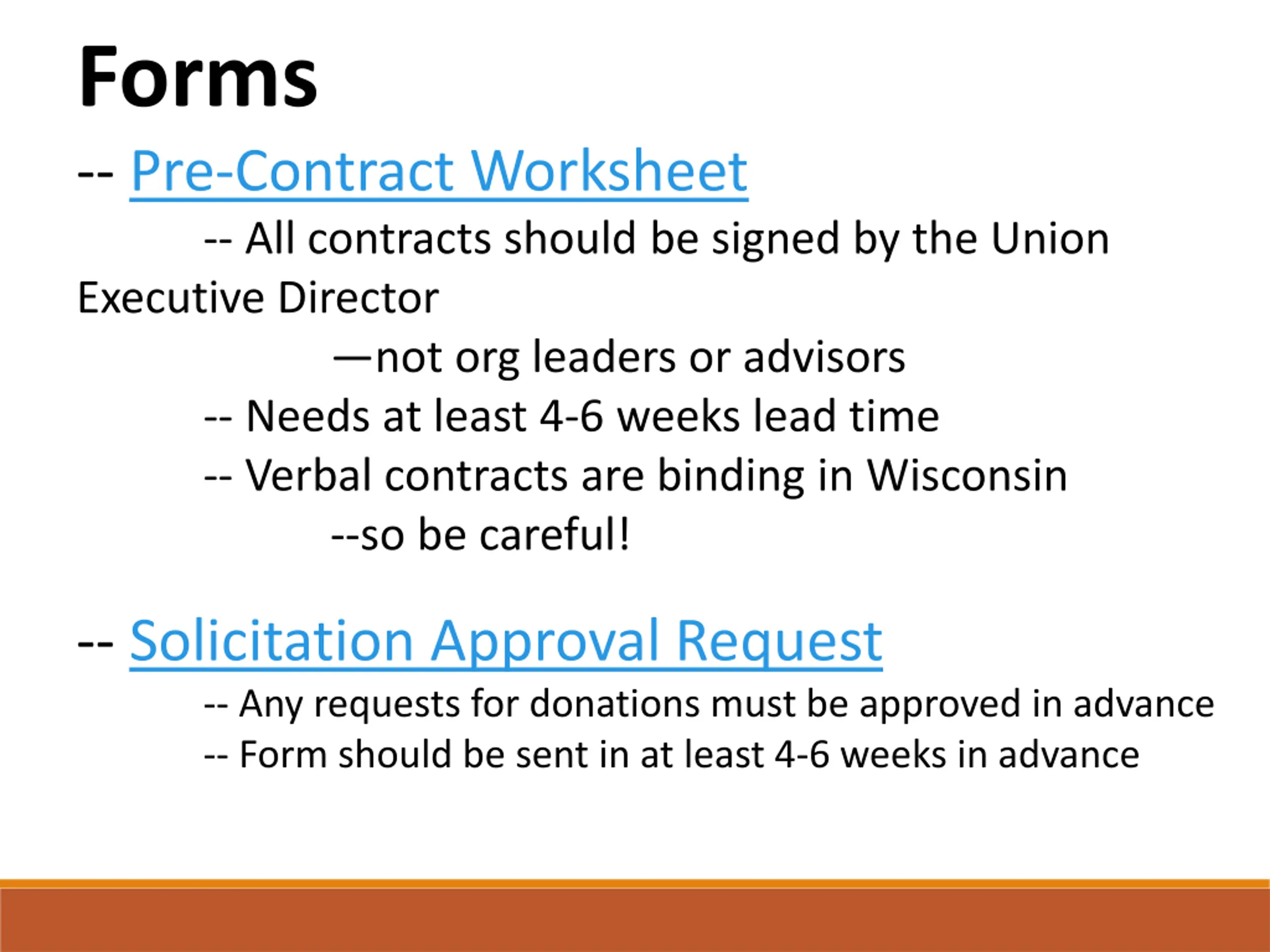 Forms -- Pre-Contract Worksheet -- All contracts should be signed by the Union Executive Director not org leaders or advisors -- Needs at least 4-6 weeks lead time -- Verbal contracts are binding in Wisconsin --so be careful! -- Solicitation Approval Request -- Any requests for donations must be approved in advance -- Form should be sent in at least 4-6 weeks in advance