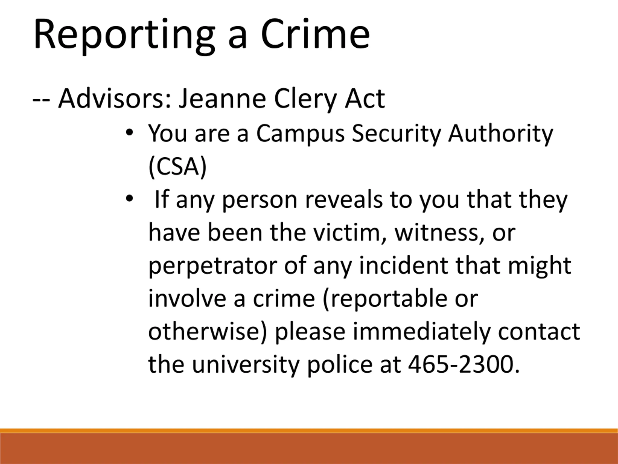Reporting a Crime -- Advisors: Jeanne Clery Act You are a Campus Security Authority (CSA) If any person reveals to you that they have been the victim, witness, or perpetrator of any incident that might involve a crime (reportable or otherwise) please immediately contact the university police at 465-2300.