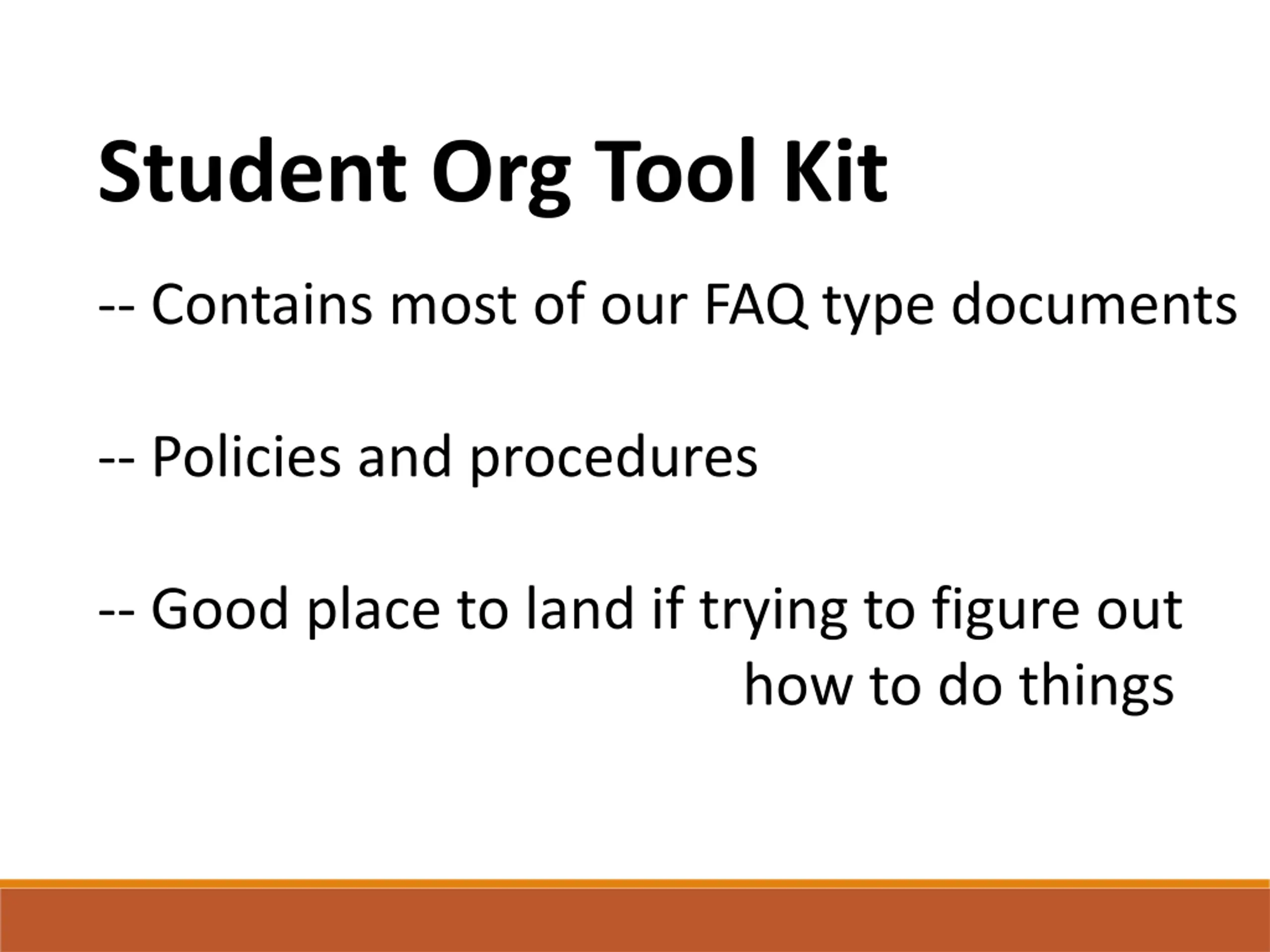 Student Org Tool Kit -- Contains most of our FAQ type documents -- Policies and procedures -- Good place to land if trying to figure out how to do things