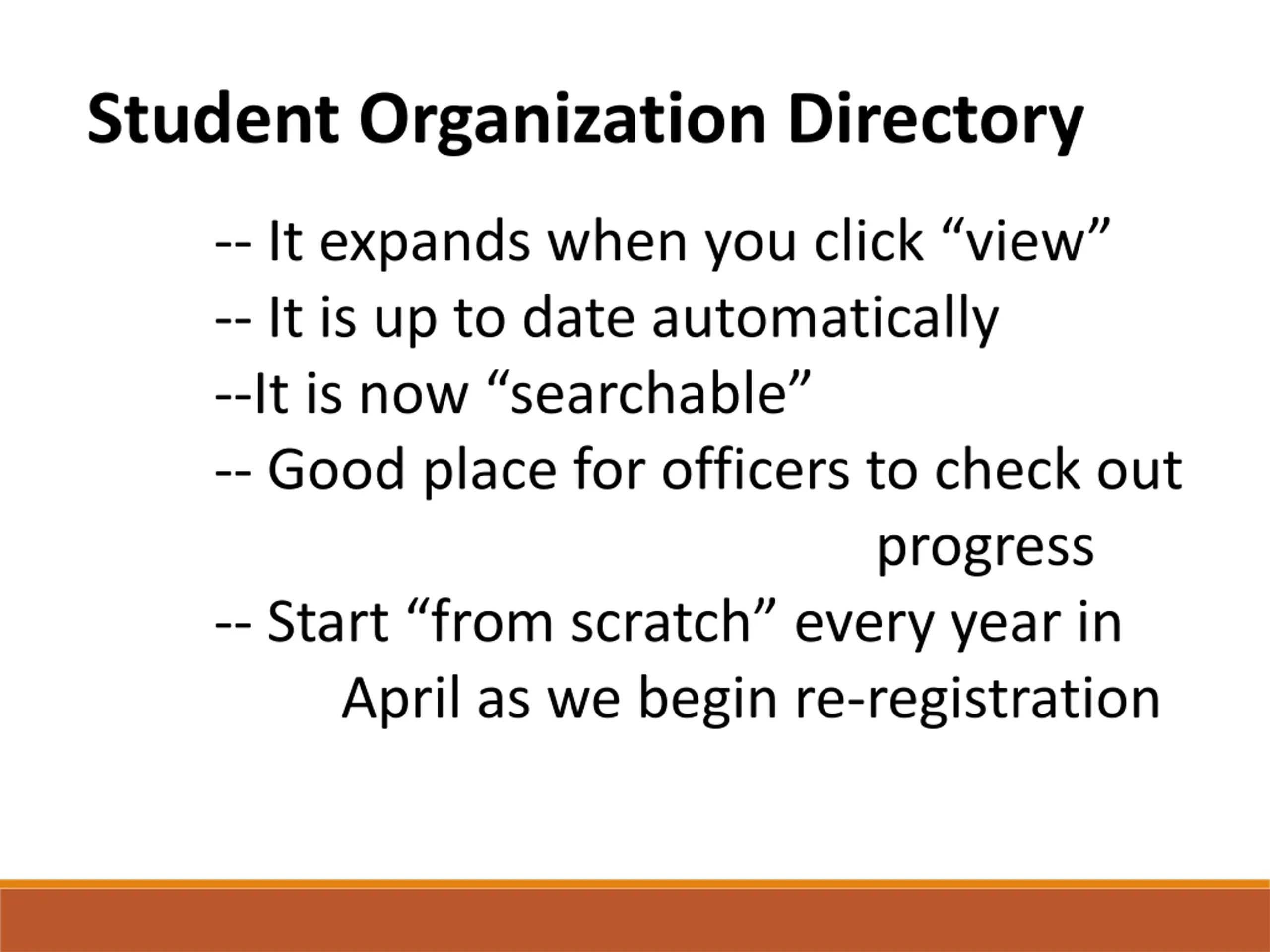 Student Organization Directory -- It expands when you click view -- It is up to date automatically --It is now searchable -- Good place for officers to check out progress -- Start from scratch every year in April as we begin re-registration