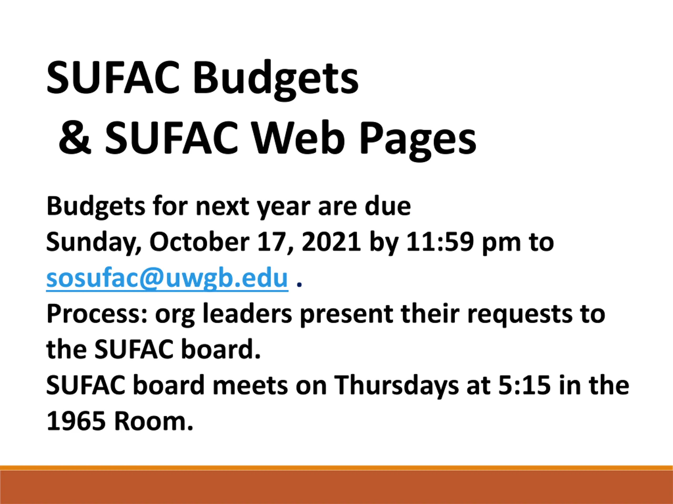 SUFAC Budgets & SUFAC Web Pages Budgets for next year are due Sunday, October 17, 2021 by 11:59 pm to sosufac@uwgb.edu . Process: org leaders present their requests to the SUFAC board. SUFAC board meets on Thursdays at 5:15 in the 1965 Room.