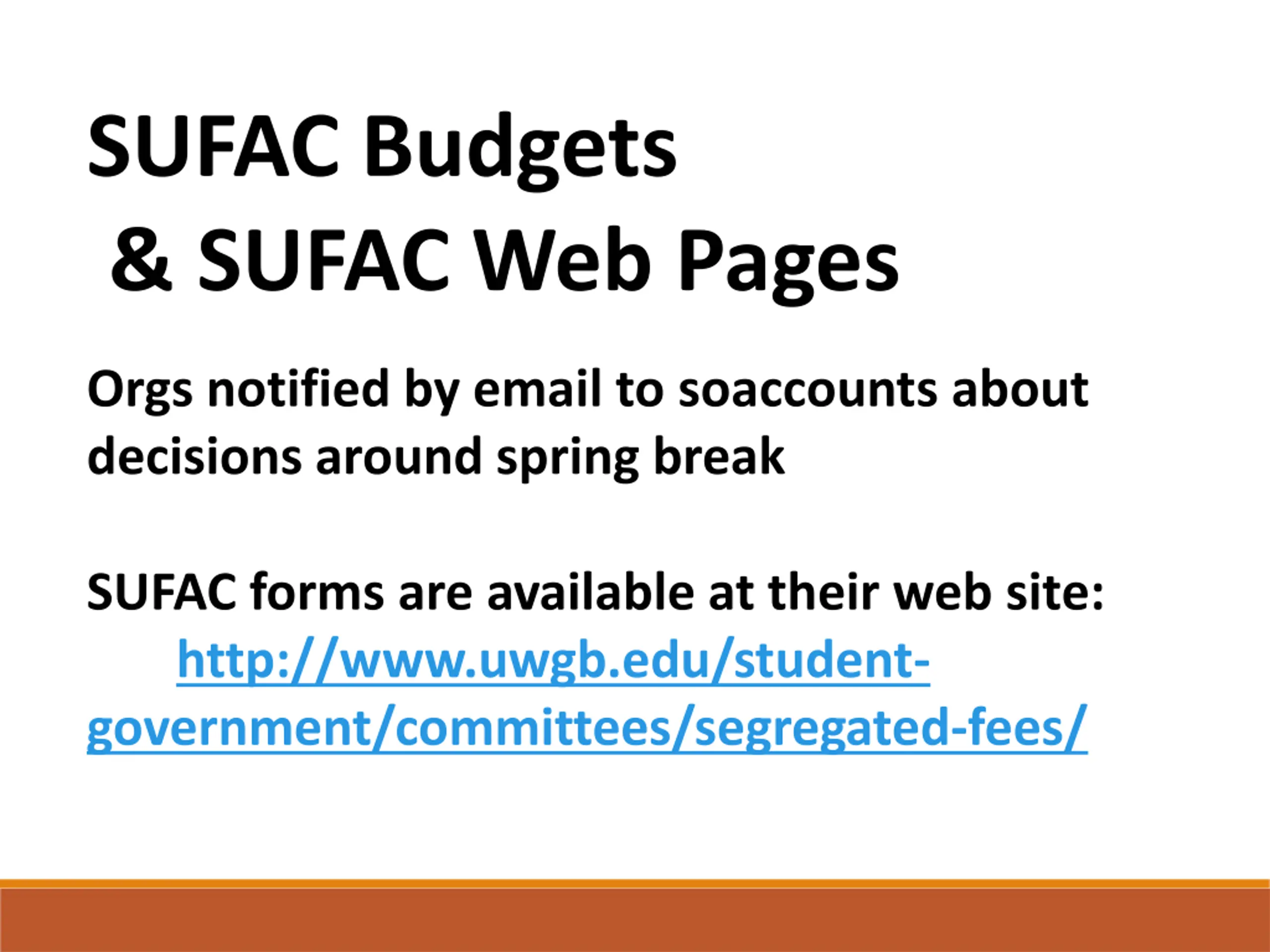 SUFAC Budgets & SUFAC Web Pages Orgs notified by email to soaccounts about decisions around spring break SUFAC forms are available at their web site: http://www.uwgb.edu/student- government/committees/segregated-fees/