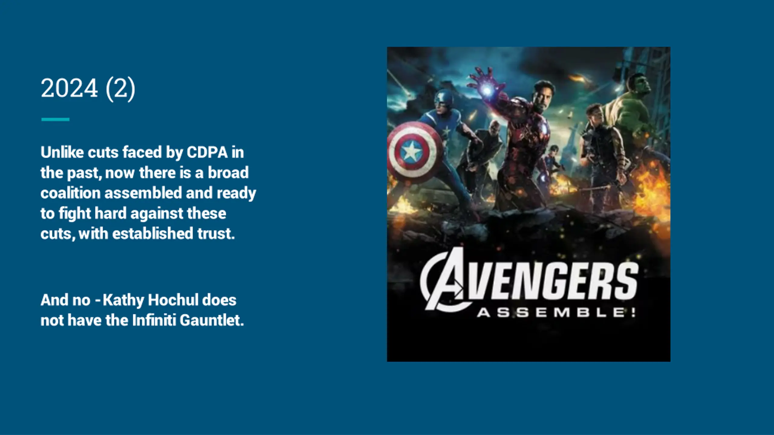 2024 (2) Unlike cuts faced by CDPA in the past, now there is a broad coalition assembled and ready to fight hard against these cuts, with established trust. And no -Kathy Hochul does not have the Infiniti Gauntlet.