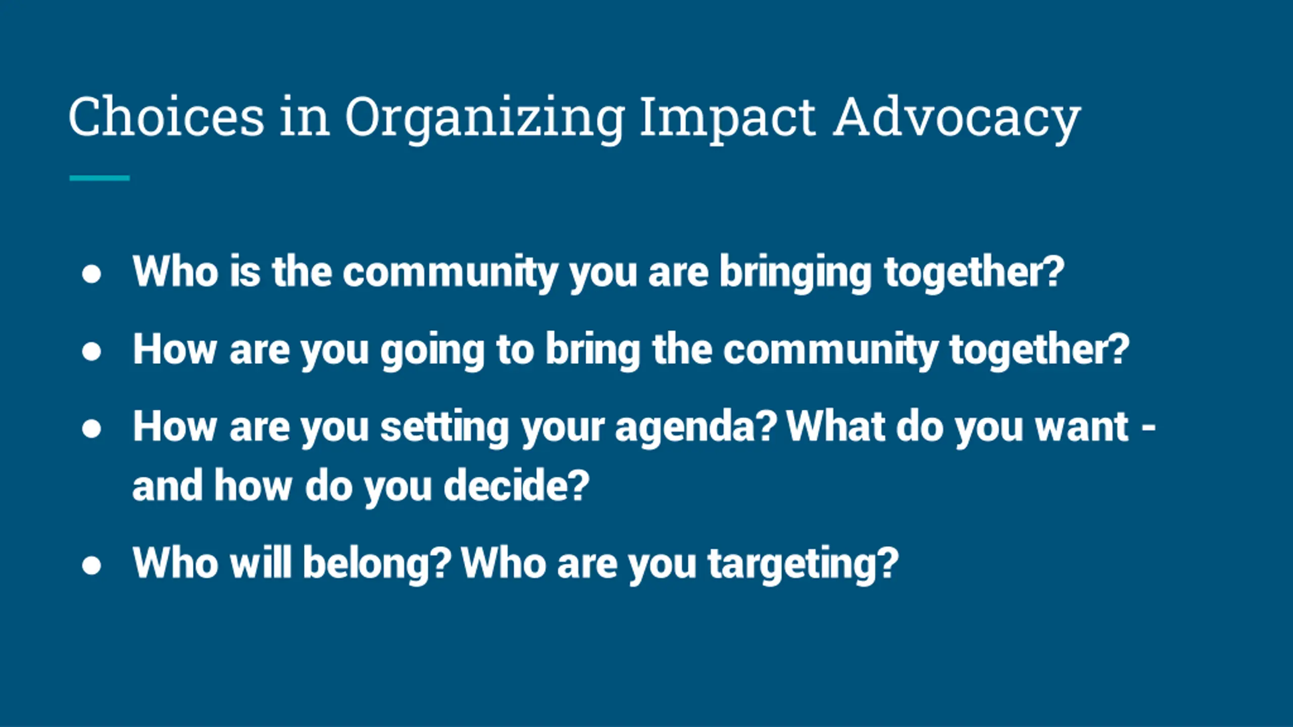 Choices in Organizing Impact Advocacy Who is the community you are bringing together? How are you going to bring the community together? How are you setting your agenda? What do you want - and how do you decide? Who will belong? Who are you targeting?