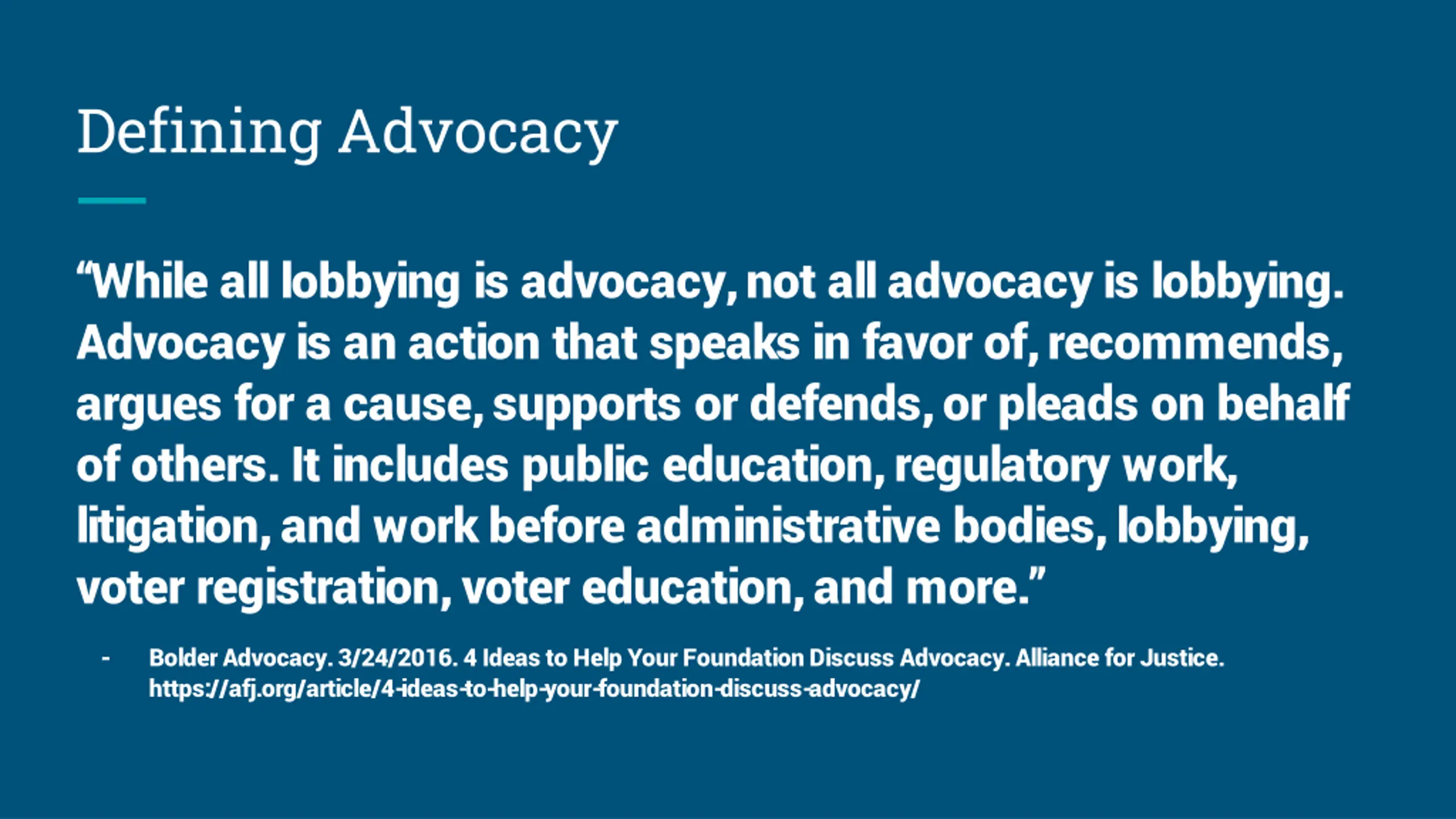 Defining Advocacy While all lobbying is advocacy, not all advocacy is lobbying. Advocacy is an action that speaks in favor of, recommends, argues for a cause, supports or defends, or pleads on behalf of others. It includes public education, regulatory work, litigation, and work before administrative bodies, lobbying, voter registration, voter education, and more. - Bolder Advocacy. 3/24/2016. 4 Ideas to Help Your Foundation Discuss Advocacy. Alliance for Justice. https://afj.org/article/4-ideas-to-help-your-foundation-discuss-advocacy/