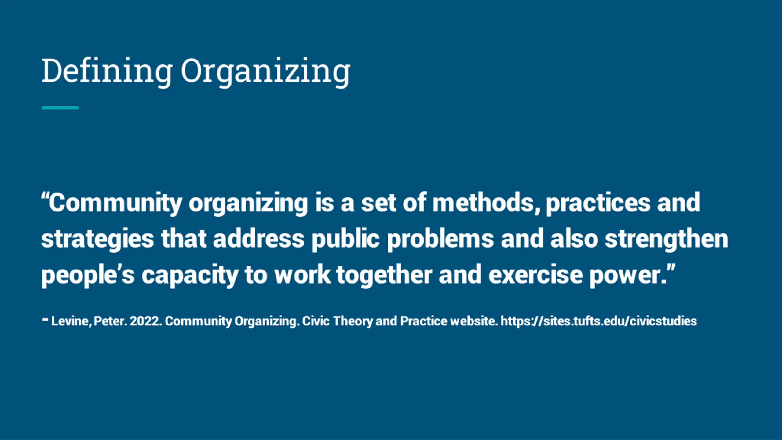 Defining Organizing Community organizing is a set of methods, practices and strategies that address public problems and also strengthen people s capacity to work together and exercise power. -Levine, Peter. 2022. Community Organizing. Civic Theory and Practice website. https://sites.tufts.edu/civicstudies