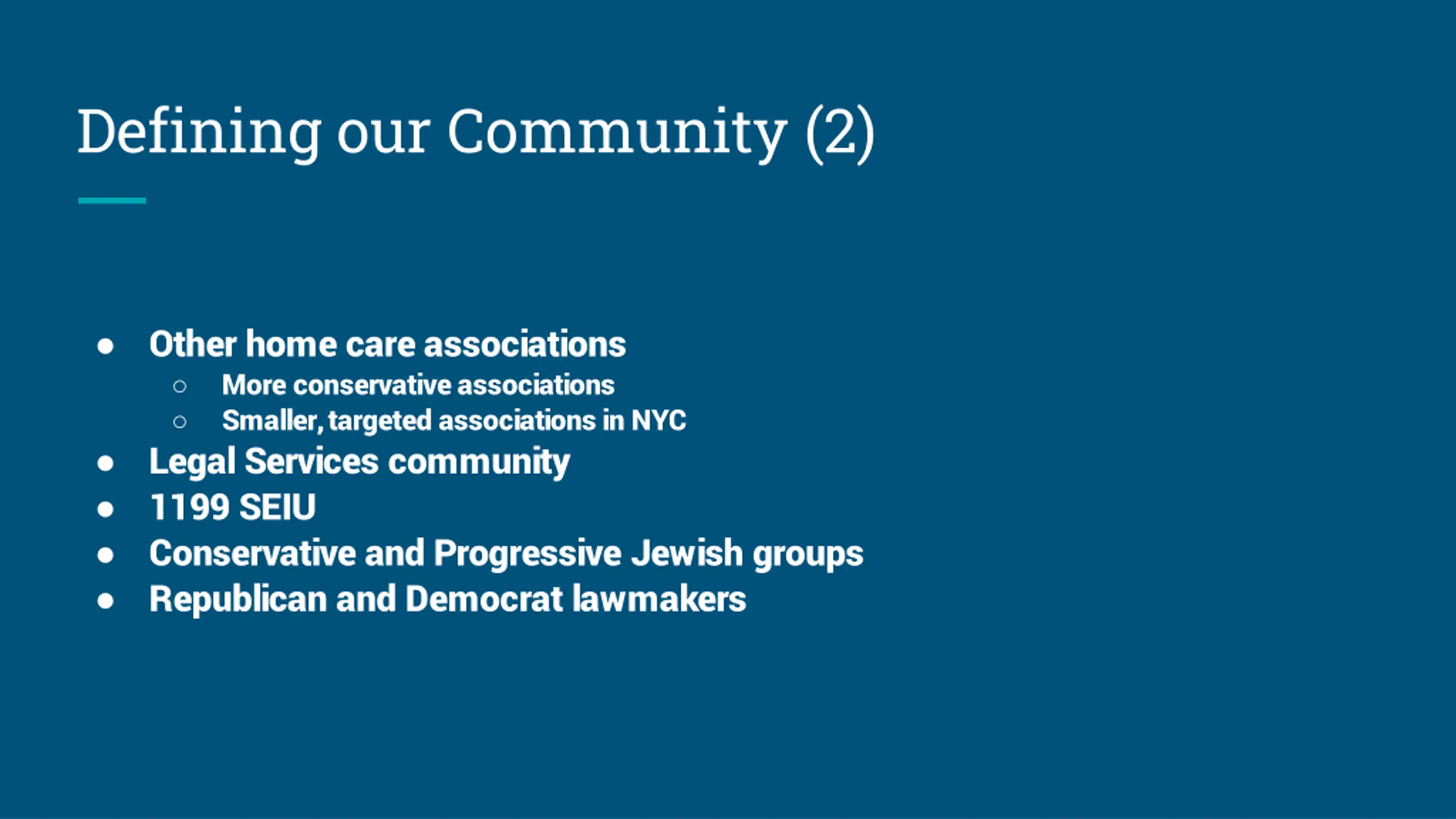 Defining our Community (2) Other home care associations More conservative associations Smaller, targeted associations in NYC Legal Services community 1199 SEIU Conservative and Progressive Jewish groups Republican and Democrat lawmakers