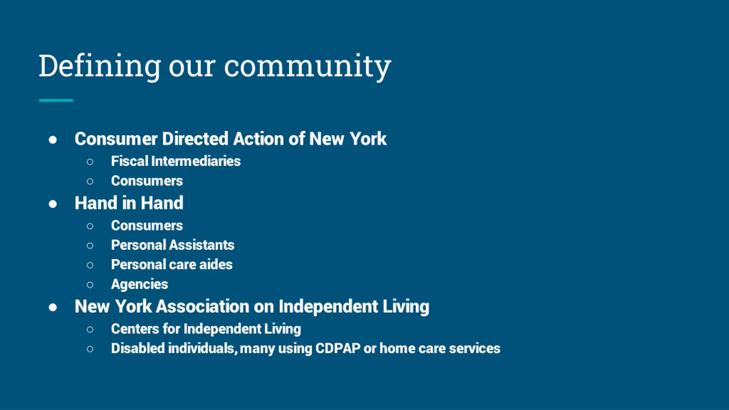 Defining our community Consumer Directed Action of New York Fiscal Intermediaries Consumers Hand in Hand Consumers Personal Assistants Personal care aides Agencies New York Association on Independent Living Centers for Independent Living Disabled individuals, many using CDPAP or home care services