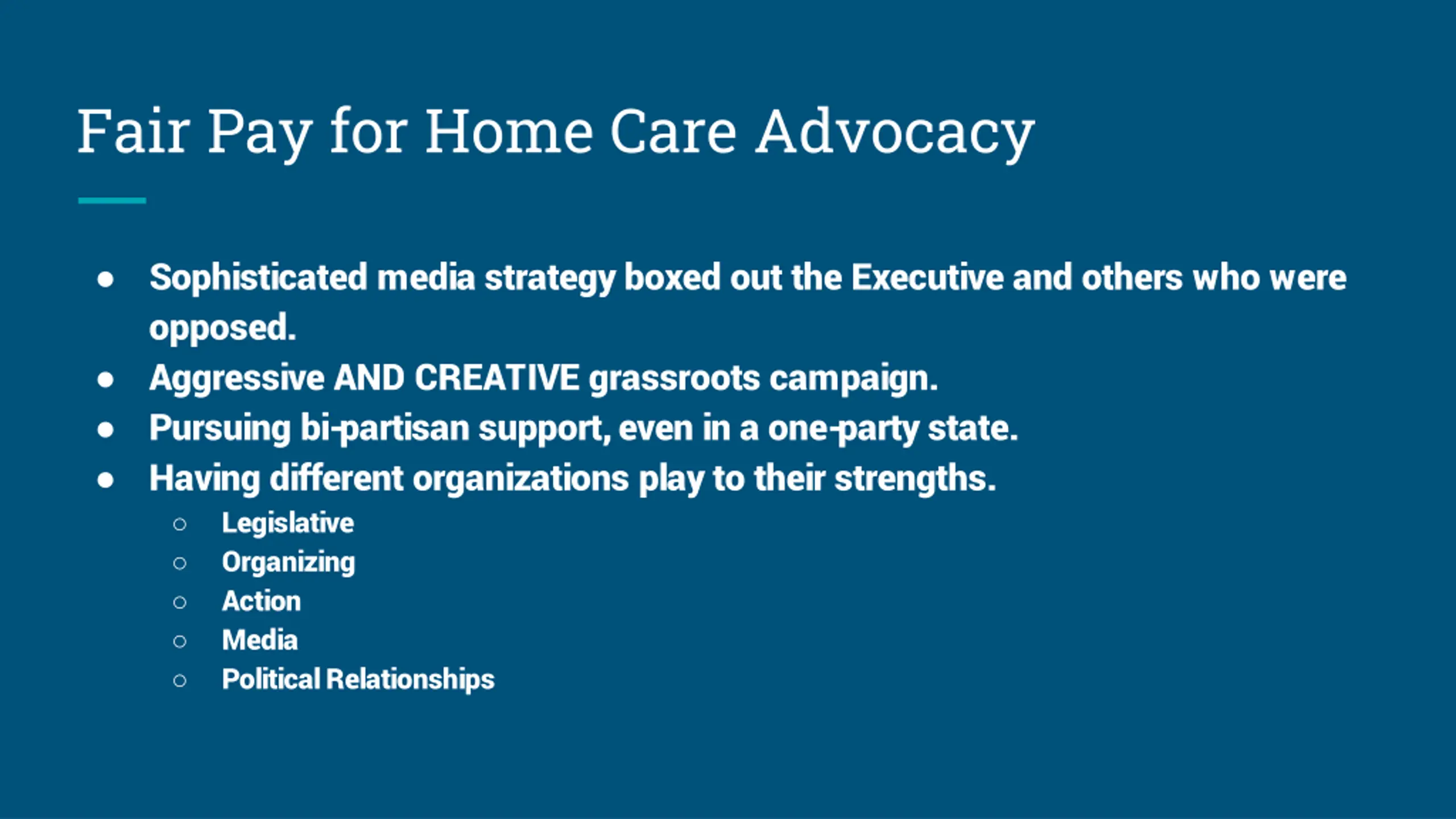 Fair Pay for Home Care Advocacy Sophisticated media strategy boxed out the Executive and others who were opposed. Aggressive AND CREATIVE grassroots campaign. Pursuing bi-partisan support, even in a one-party state. Having different organizations play to their strengths. Legislative Organizing Action Media Political Relationships