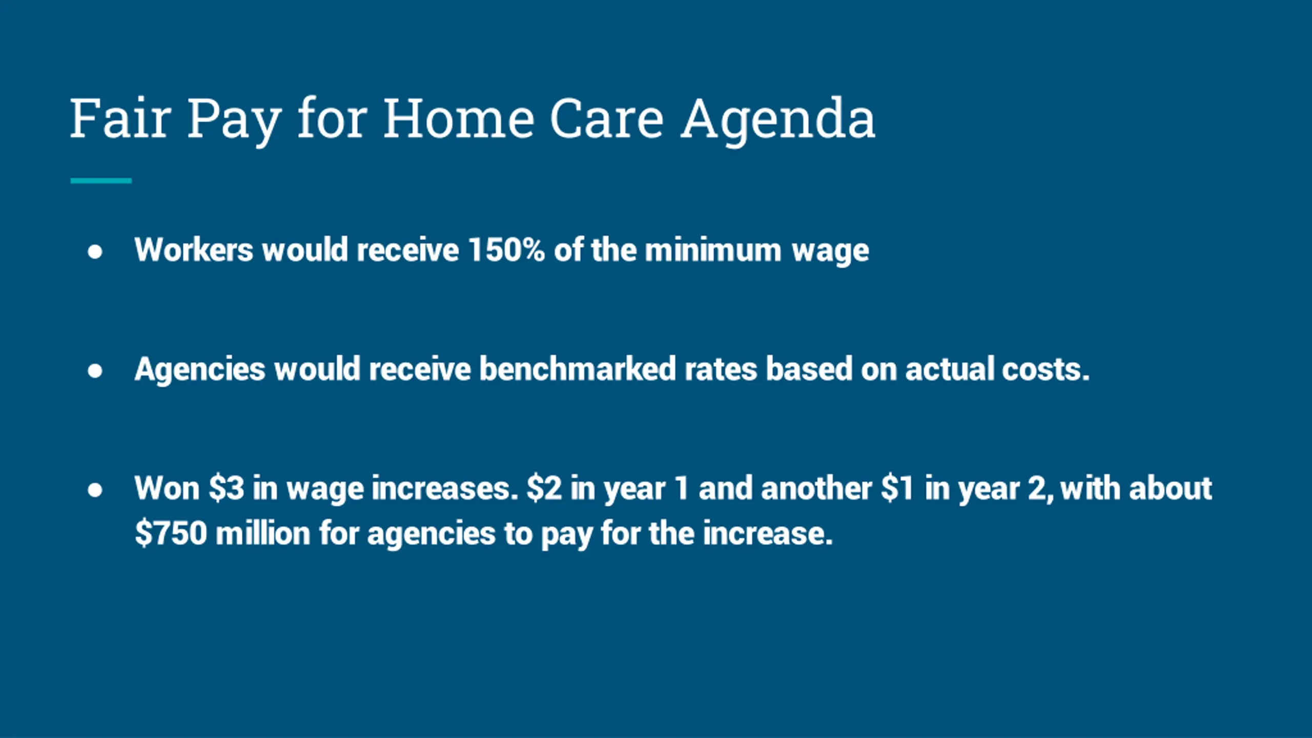 Fair Pay for Home Care Agenda Workers would receive 150% of the minimum wage Agencies would receive benchmarked rates based on actual costs. Won $3 in wage increases. $2 in year 1 and another $1 in year 2, with about $750 million for agencies to pay for the increase.