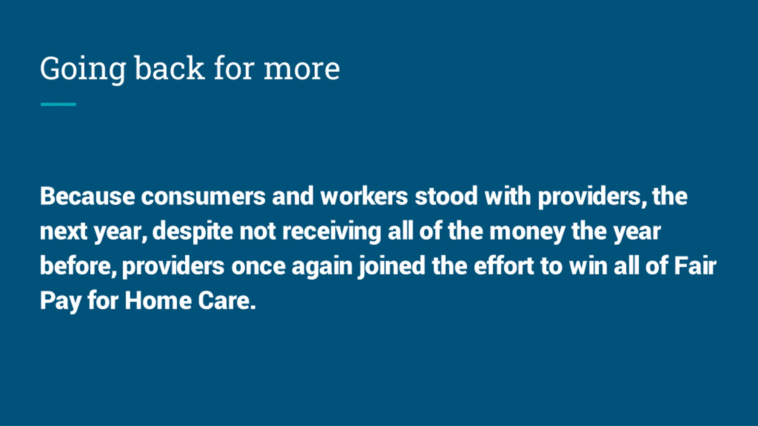 Going back for more Because consumers and workers stood with providers, the next year, despite not receiving all of the money the year before, providers once again joined the effort to win all of Fair Pay for Home Care.