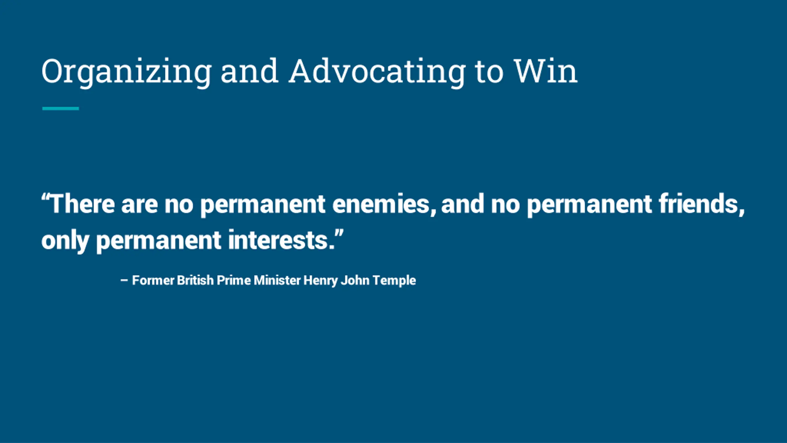 Organizing and Advocating to Win There are no permanent enemies, and no permanent friends, only permanent interests. Former British Prime Minister Henry John Temple
