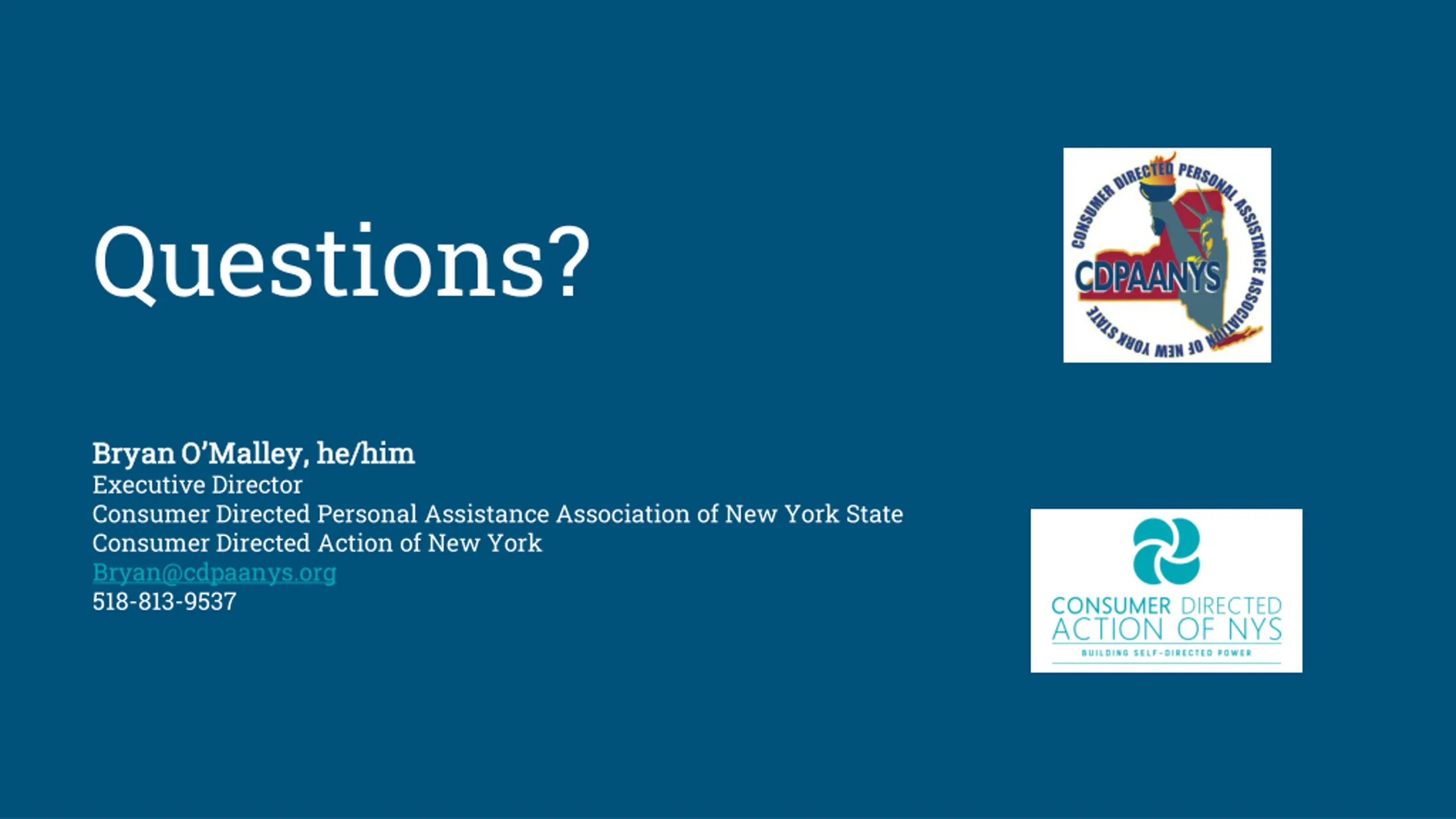 Questions? Bryan O Malley, he/him Bryan O Malley, he/him Executive Director Consumer Directed Personal Assistance Association of New York State Consumer Directed Action of New York Bryan@cdpaanys.org 518-813-9537