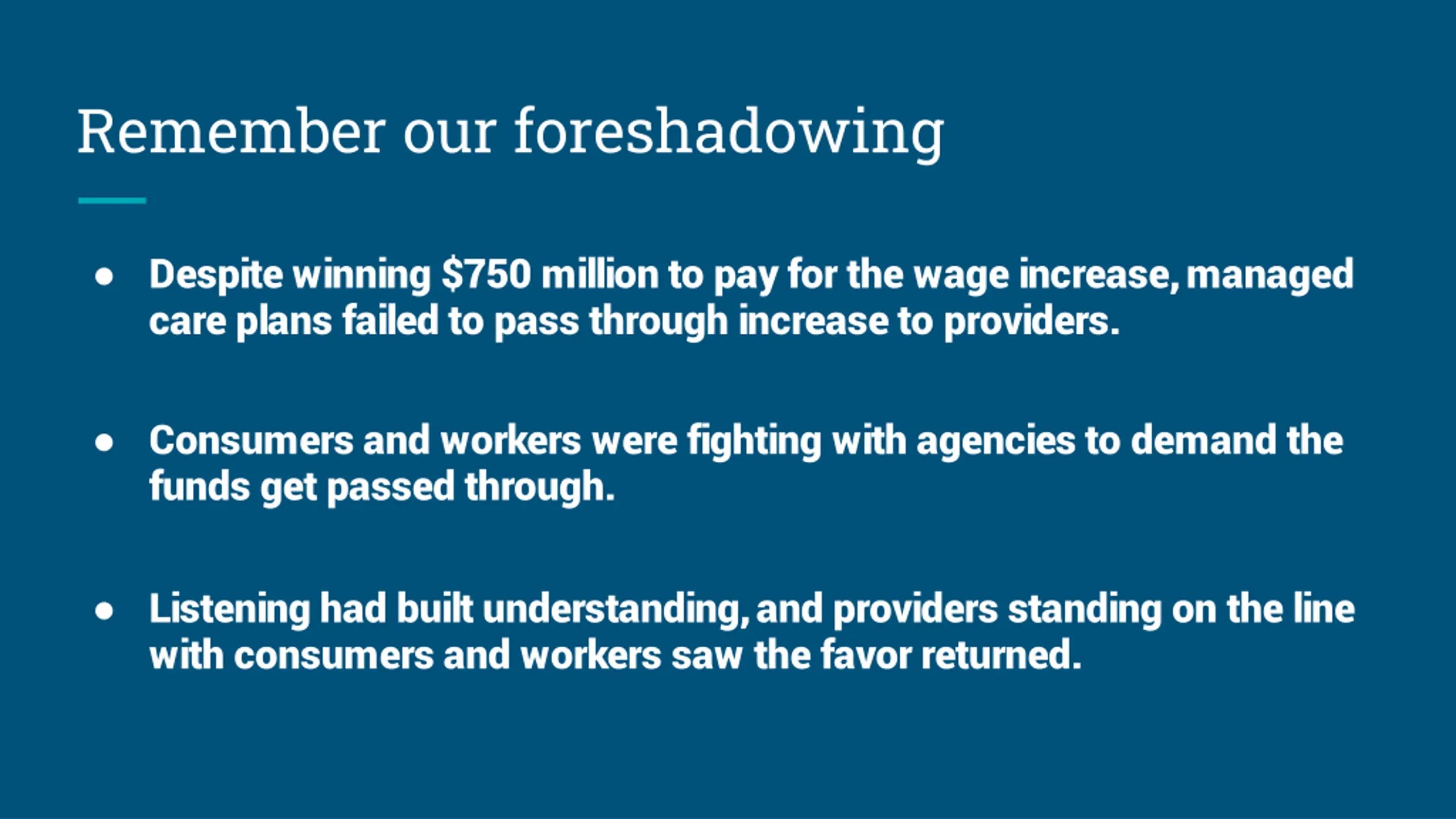 Remember our foreshadowing Despite winning $750 million to pay for the wage increase, managed care plans failed to pass through increase to providers. Consumers and workers were fighting with agencies to demand the funds get passed through. Listening had built understanding, and providers standing on the line with consumers and workers saw the favor returned.