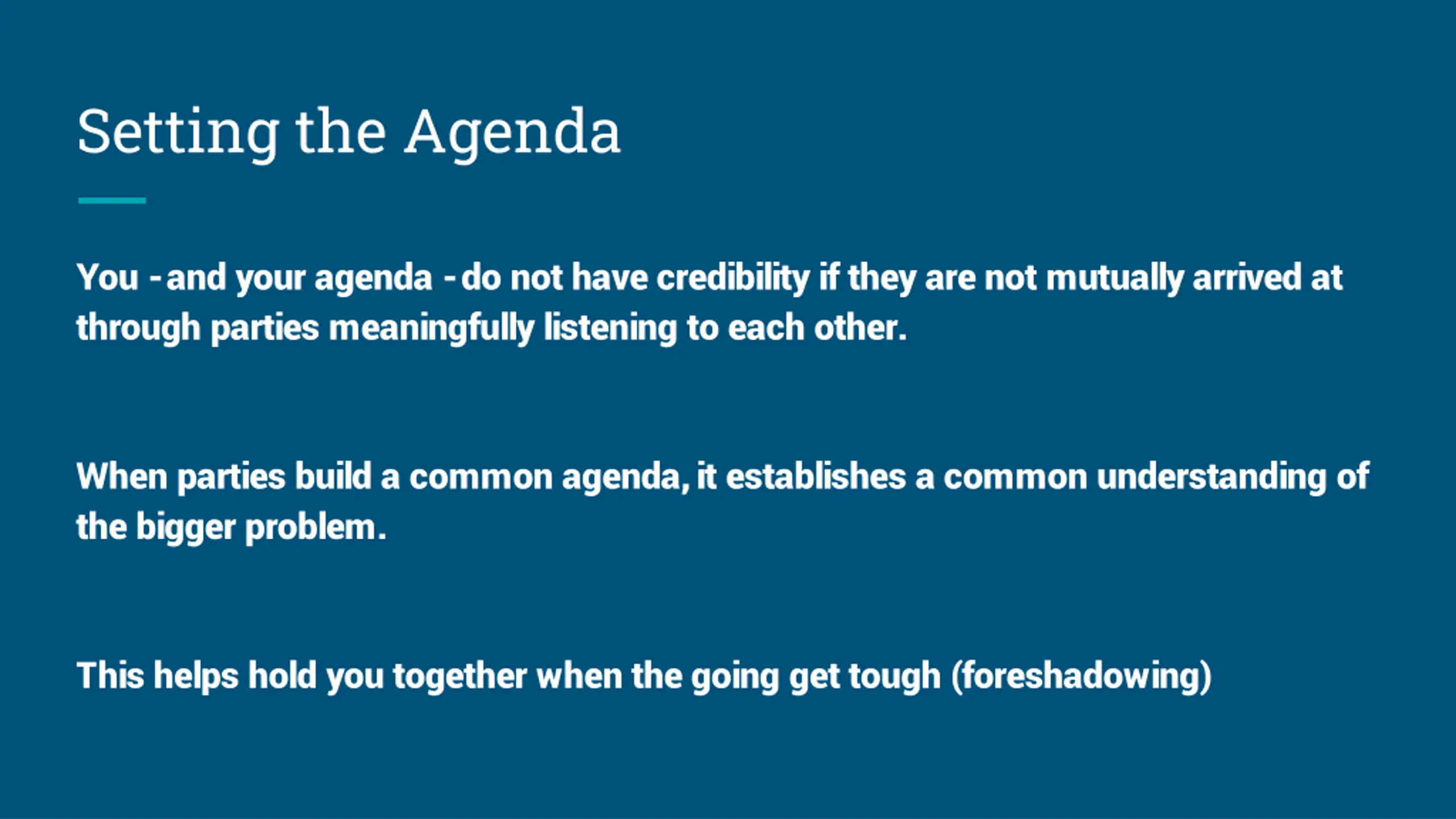 Setting the Agenda You -and your agenda -do not have credibility if they are not mutually arrived at through parties meaningfully listening to each other. When parties build a common agenda, it establishes a common understanding of the bigger problem. This helps hold you together when the going get tough (foreshadowing)