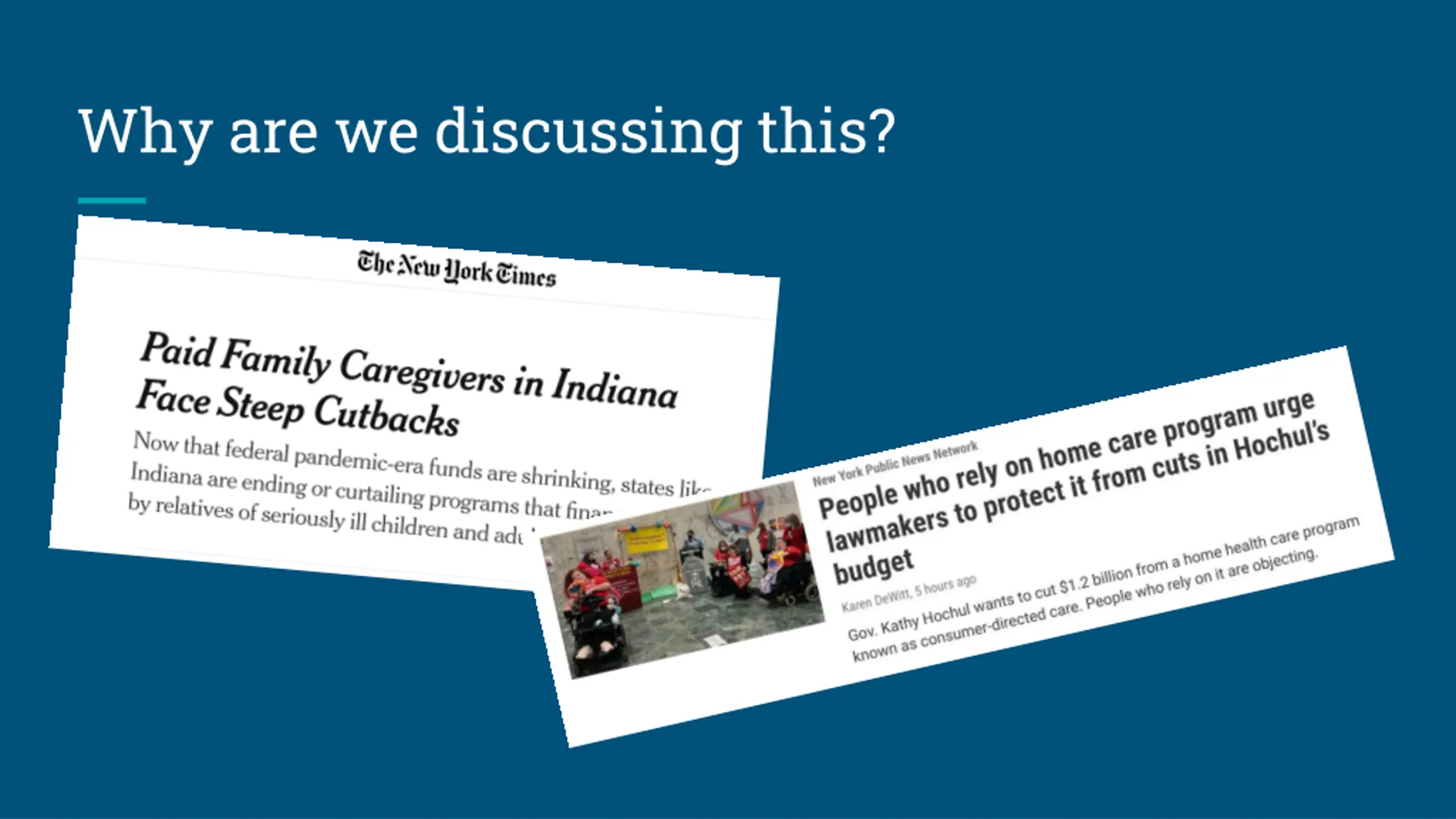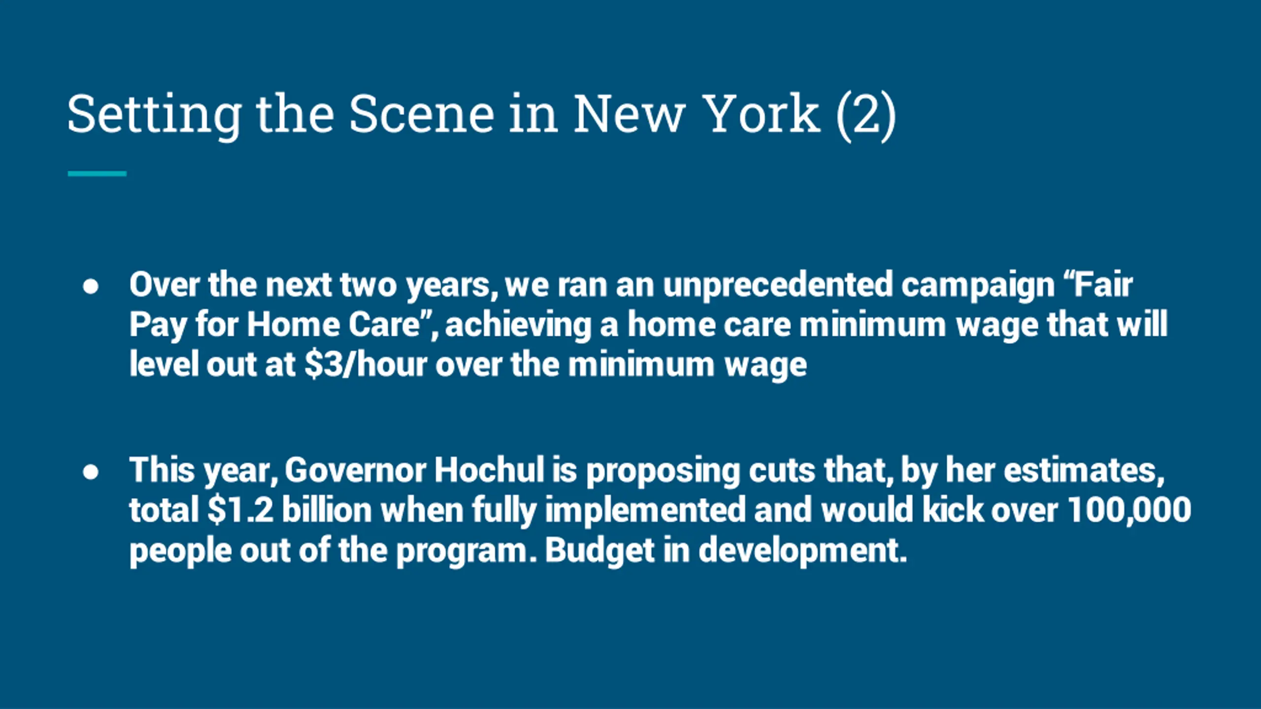 Setting the Scene in New York (2) Over the next two years, we ran an unprecedented campaign Fair Pay for Home Care , achieving a home care minimum wage that will level out at $3/hour over the minimum wage This year, Governor Hochul is proposing cuts that, by her estimates, total $1.2 billion when fully implemented and would kick over 100,000 people out of the program. Budget in development.