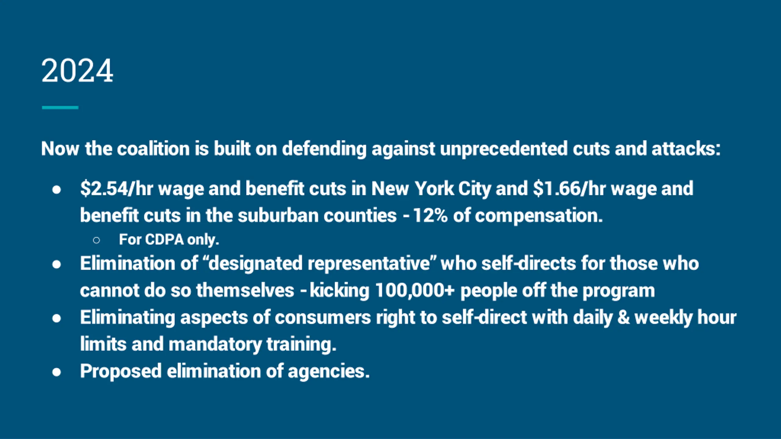 2024 Now the coalition is built on defending against unprecedented cuts and attacks: $2.54/hr wage and benefit cuts in New York City and $1.66/hr wage and benefit cuts in the suburban counties -12% of compensation. For CDPA only. Elimination of designated representative who self-directs for those who cannot do so themselves -kicking 100,000+ people off the program Eliminating aspects of consumers right to self-direct with daily & weekly hour limits and mandatory training. Proposed elimination of agencies.