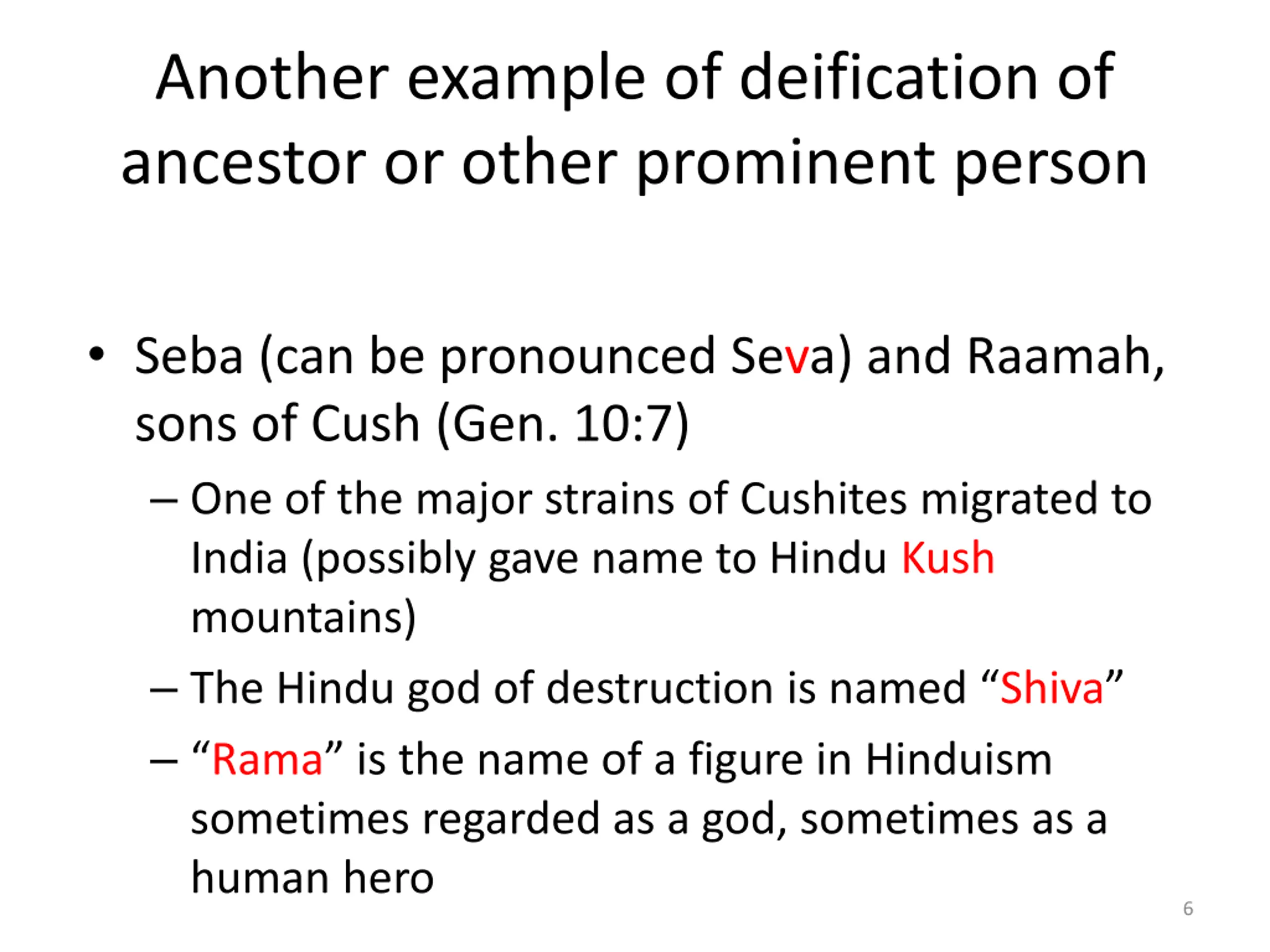 Another example of deification of ancestor or other prominent person Seba (can be pronounced Seva) and Raamah, sons of Cush (Gen. 10:7) One of the major strains of Cushites migrated to India (possibly gave name to Hindu Kush mountains) The Hindu god of destruction is named Shiva Rama is the name of a figure in Hinduism sometimes regarded as a god, sometimes as a human hero 6