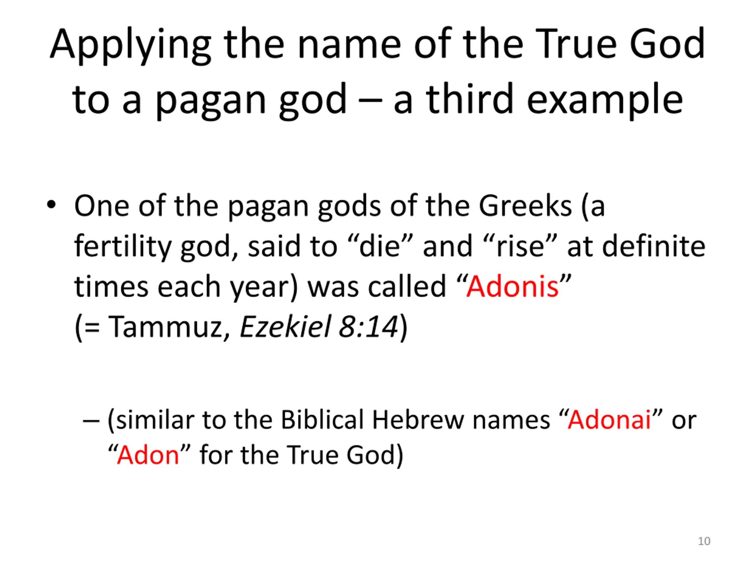 Applying the name of the True God to a pagan god a third example One of the pagan gods of the Greeks (a fertility god, said to die and rise at definite times each year) was called Adonis (= Tammuz, Ezekiel 8:14) (similar to the Biblical Hebrew names Adonai or Adon for the True God) 10
