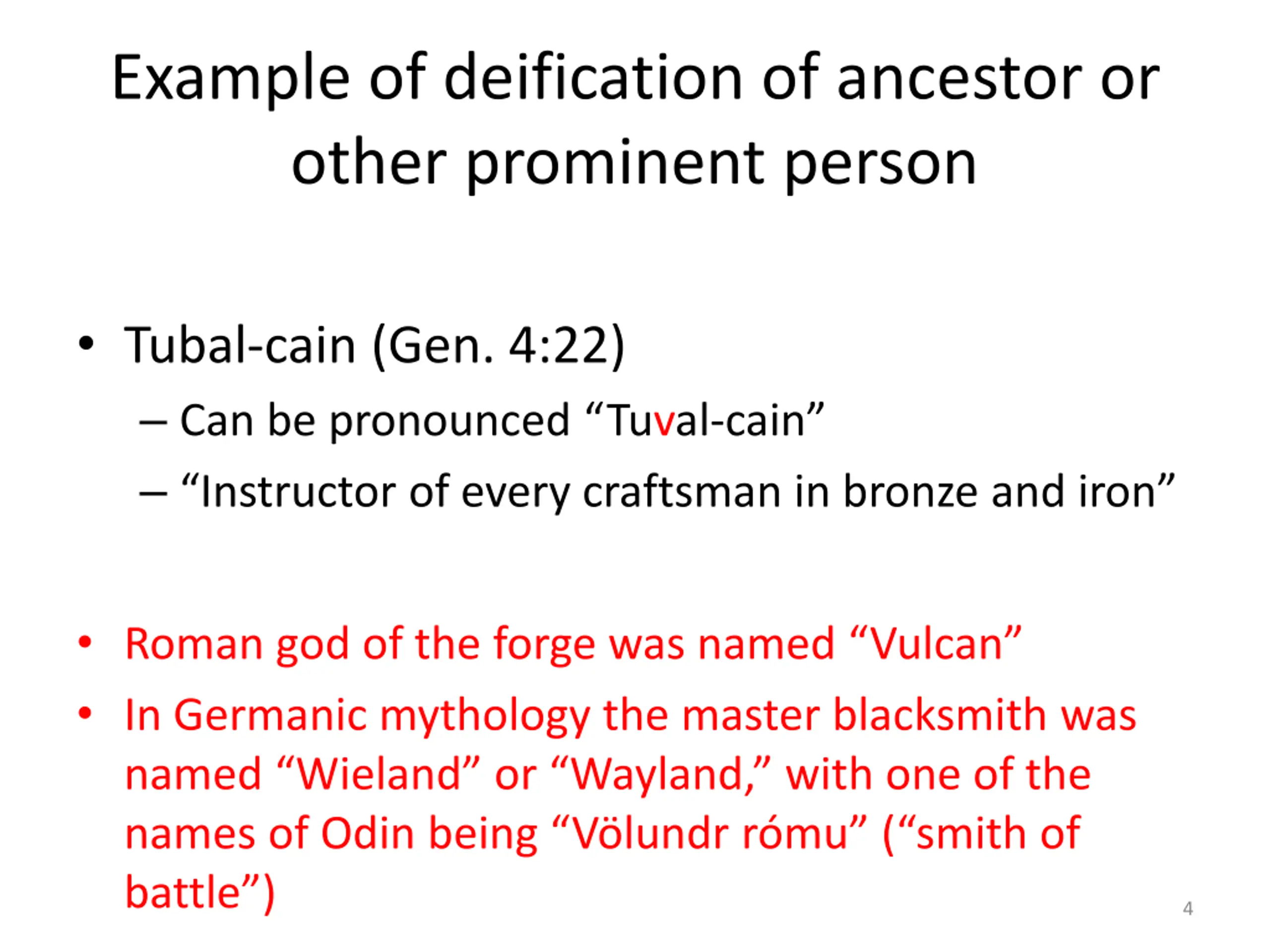 Example of deification of ancestor or other prominent person Tubal-cain (Gen. 4:22) Can be pronounced Tuval-cain Instructor of every craftsman in bronze and iron Roman god of the forge was named Vulcan In Germanic mythology the master blacksmith was named Wieland or Wayland, with one of the names of Odin being V lundr r mu ( smith of battle ) 4