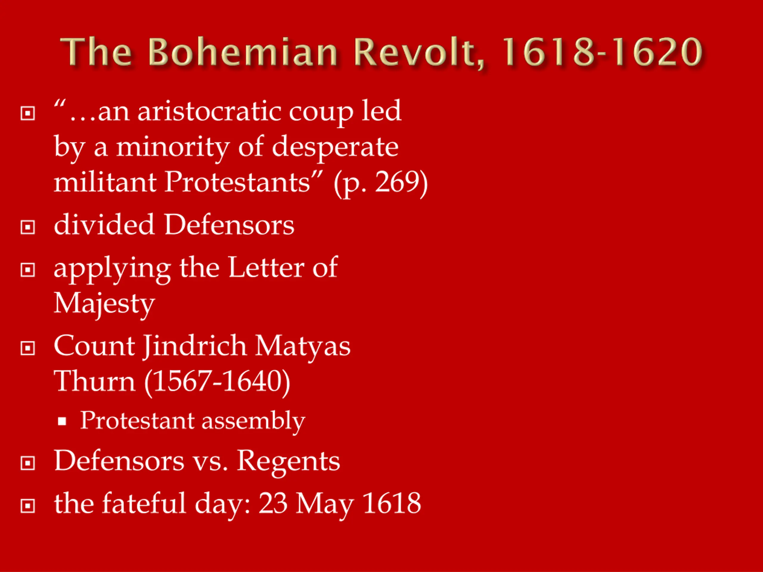 an aristocratic coup led by a minority of desperate militant Protestants (p. 269) divided Defensors applying the Letter of Majesty Count Jindrich Matyas Thurn (1567-1640) Protestant assembly Defensors vs. Regents the fateful day: 23 May 1618