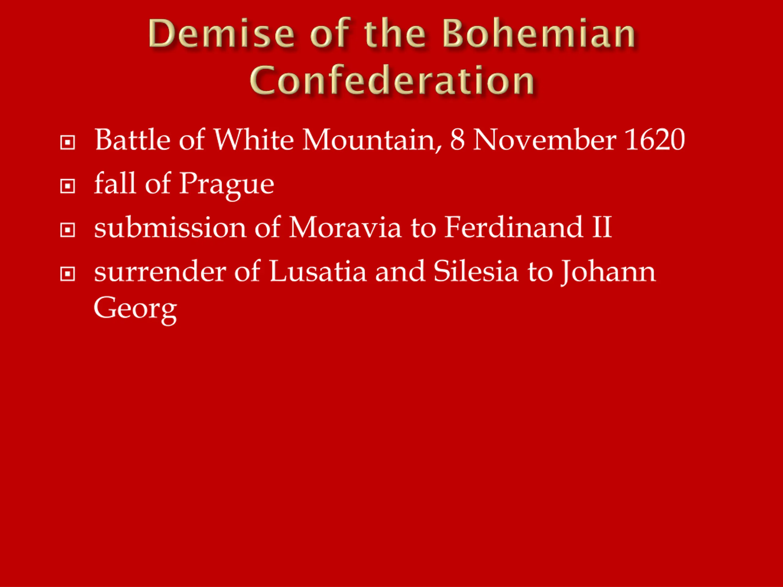 Battle of White Mountain, 8 November 1620 fall of Prague submission of Moravia to Ferdinand II surrender of Lusatia and Silesia to Johann Georg