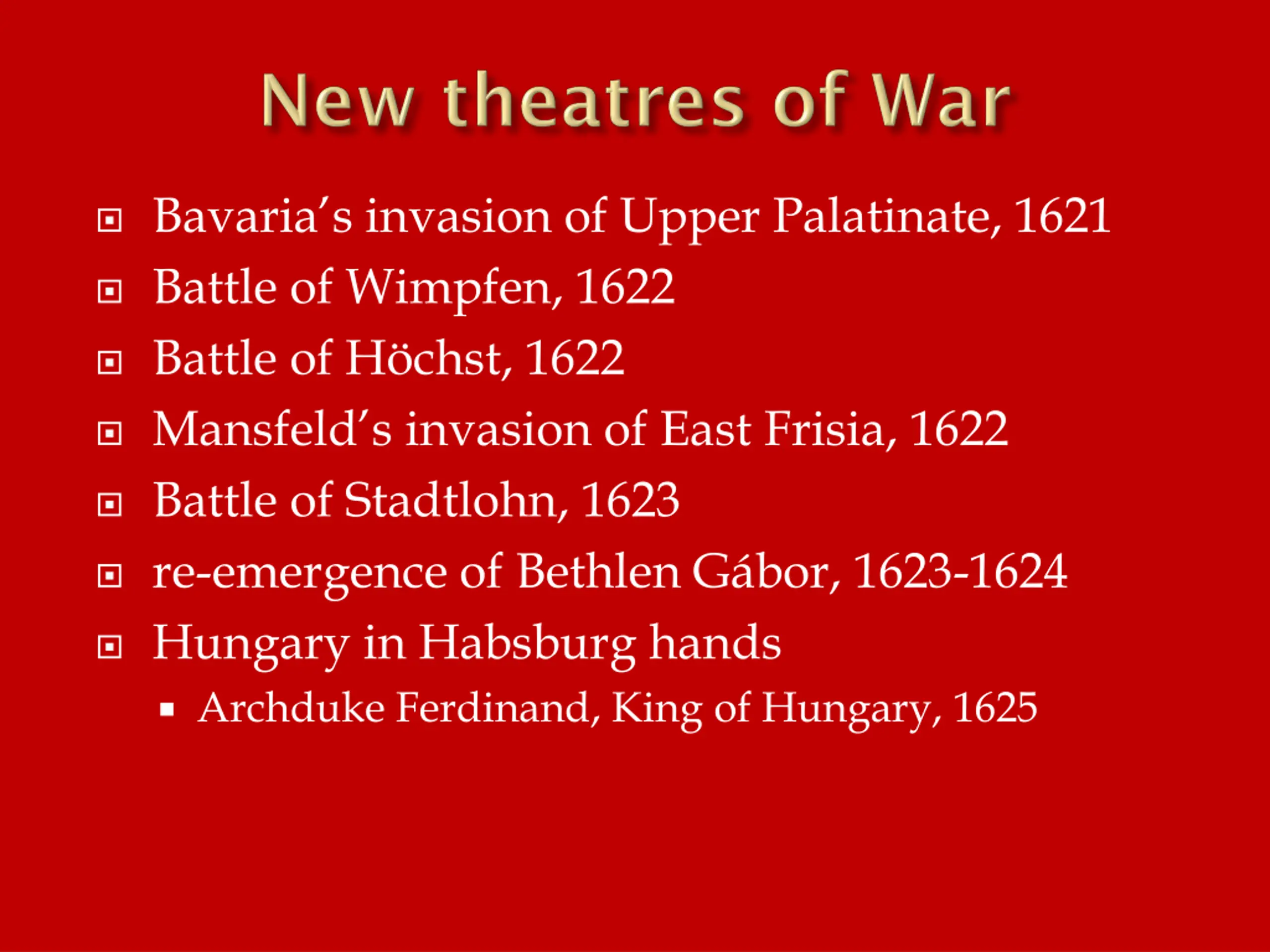 Bavarias invasion of Upper Palatinate, 1621 Battle of Wimpfen, 1622 Battle of H chst, 1622 Mansfeld s invasion of East Frisia, 1622 Battle of Stadtlohn, 1623 re-emergence of Bethlen G bor, 1623-1624 Hungary in Habsburg hands Archduke Ferdinand, King of Hungary, 1625