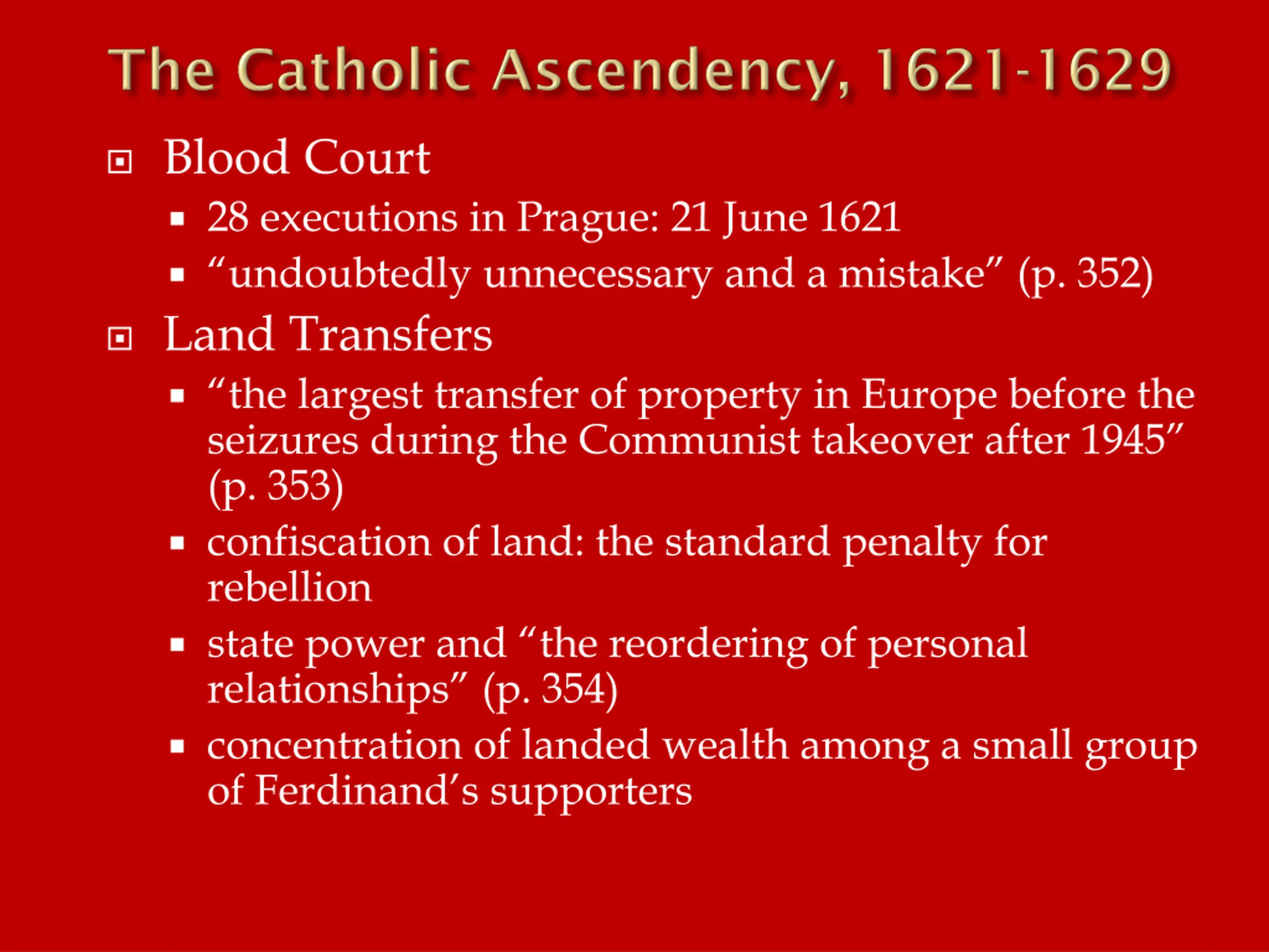Blood Court 28 executions in Prague: 21 June 1621 undoubtedly unnecessary and a mistake (p. 352) Land Transfers the largest transfer of property in Europe before the seizures during the Communist takeover after 1945 (p. 353) confiscation of land: the standard penalty for rebellion state power and the reordering of personal relationships (p. 354) concentration of landed wealth among a small group of Ferdinand s supporters