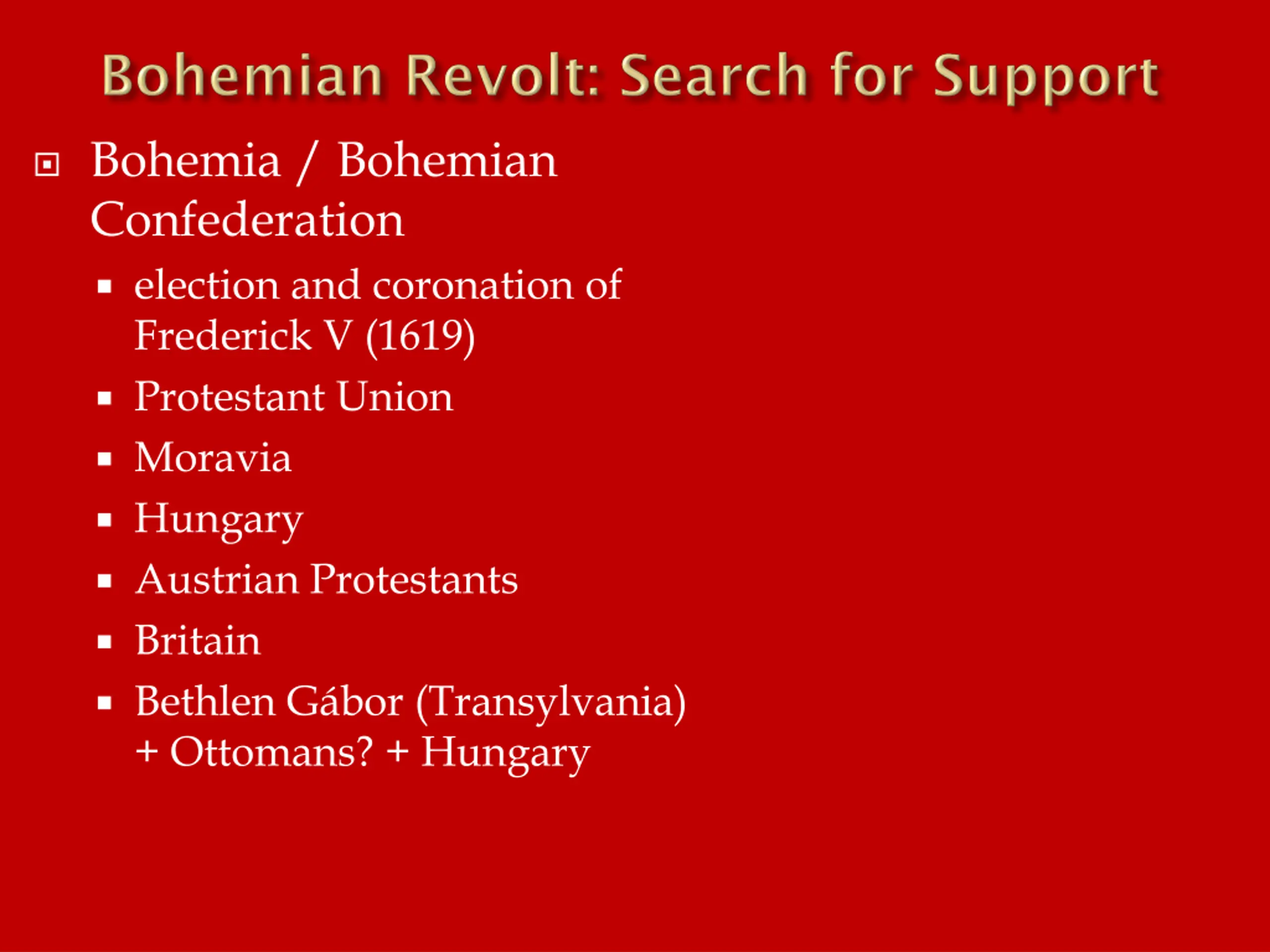 Bohemia / Bohemian Confederation election and coronation of Frederick V (1619) Protestant Union Moravia Hungary Austrian Protestants Britain Bethlen G bor (Transylvania) + Ottomans? + Hungary