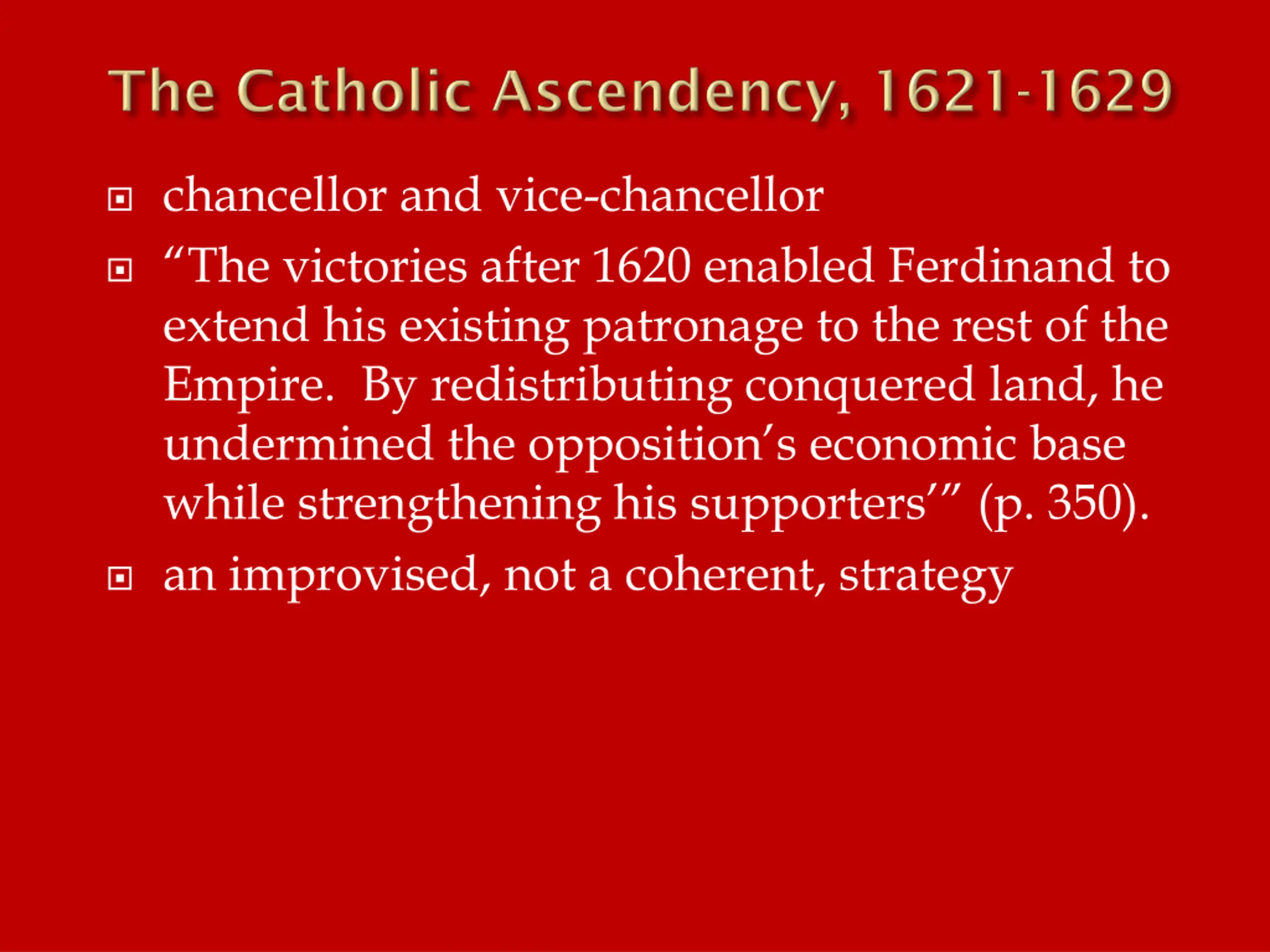 chancellor and vice-chancellor The victories after 1620 enabled Ferdinand to extend his existing patronage to the rest of the Empire. By redistributing conquered land, he undermined the opposition s economic base while strengthening his supporters (p. 350). an improvised, not a coherent, strategy