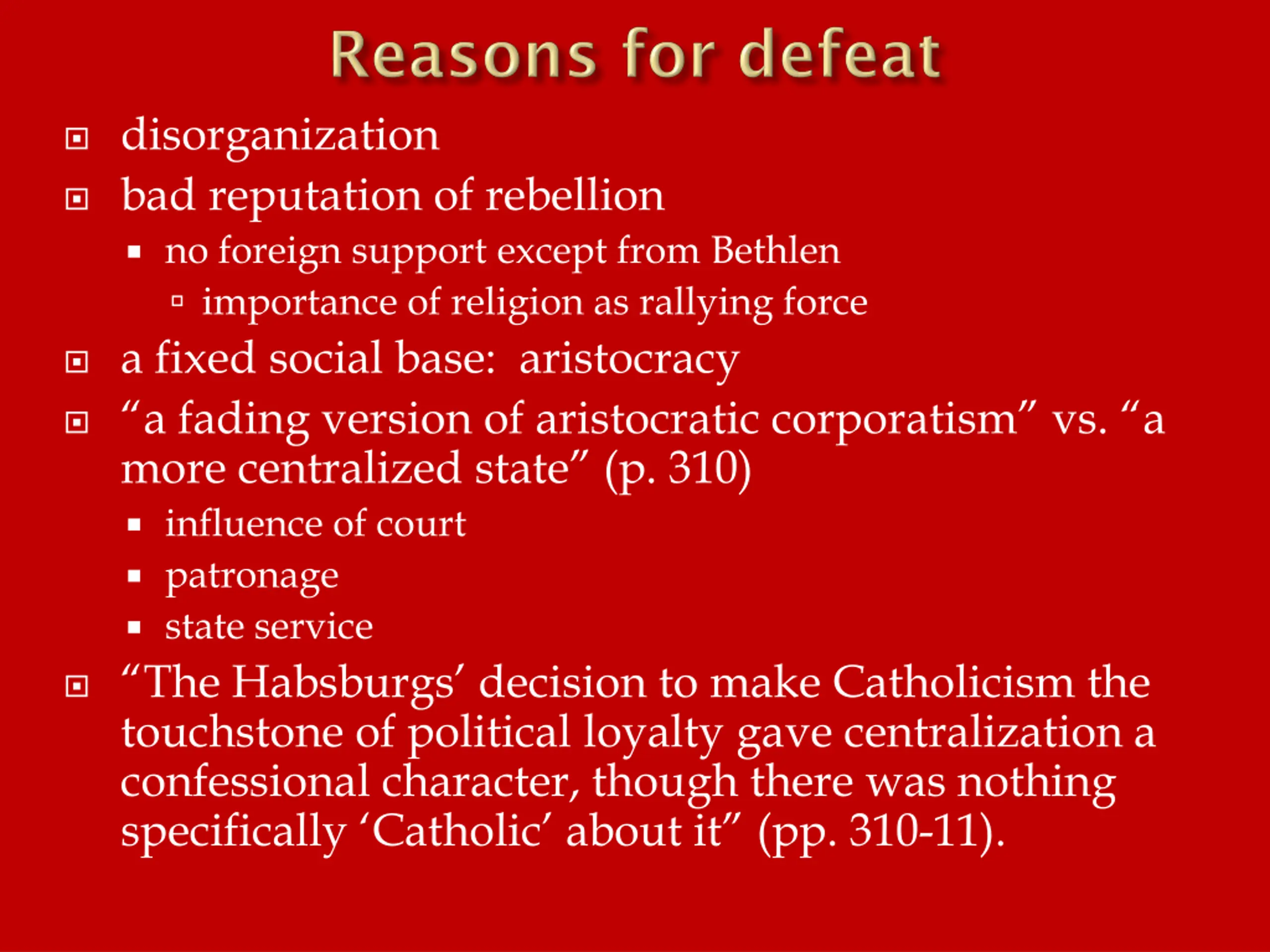 disorganization bad reputation of rebellion no foreign support except from Bethlen importance of religion as rallying force a fixed social base: aristocracy a fading version of aristocratic corporatism vs. a more centralized state (p. 310) influence of court patronage state service The Habsburgs decision to make Catholicism the touchstone of political loyalty gave centralization a confessional character, though there was nothing specifically Catholic about it (pp. 310-11).