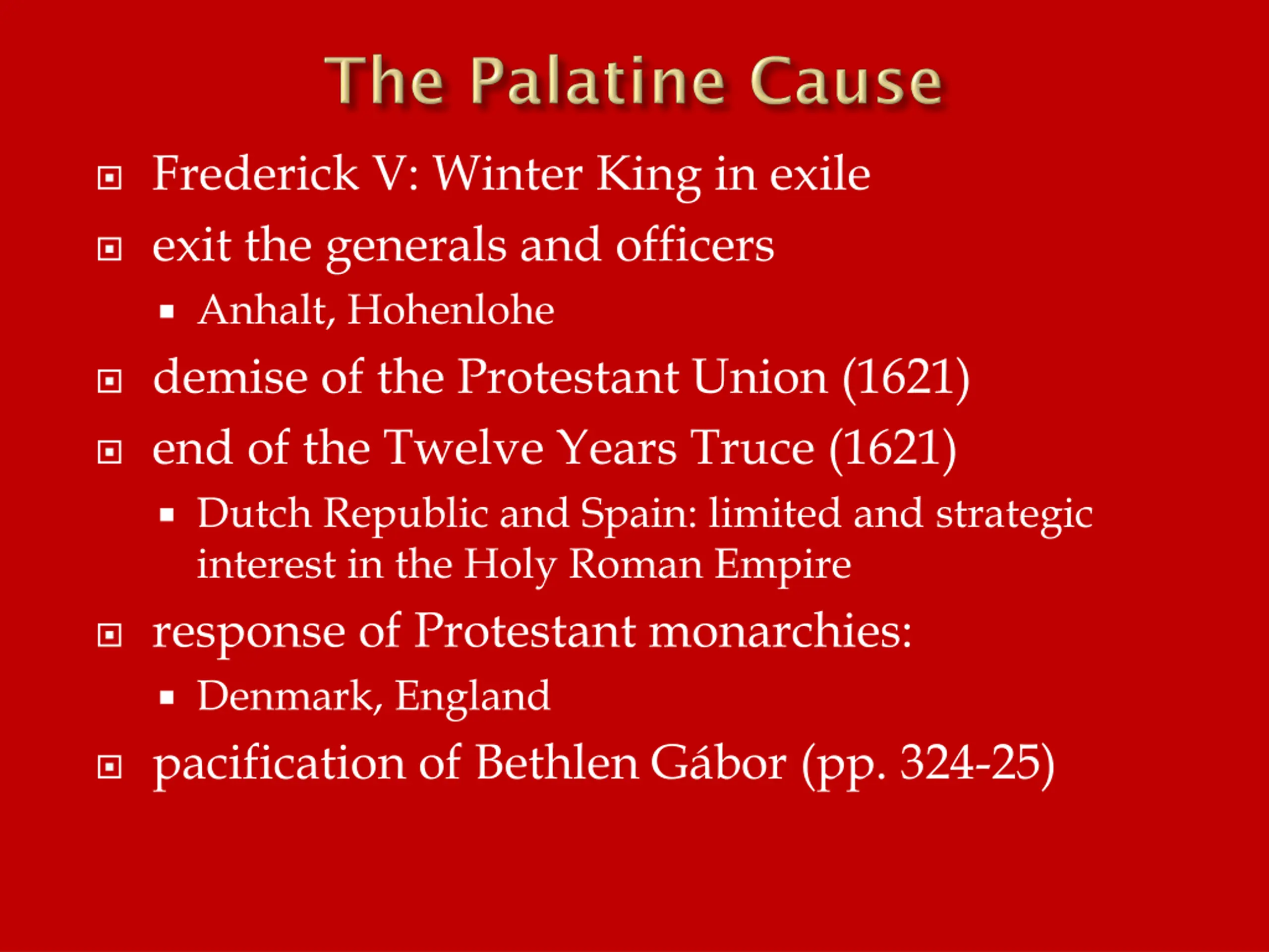 Frederick V: Winter King in exile exit the generals and officers Anhalt, Hohenlohe demise of the Protestant Union (1621) end of the Twelve Years Truce (1621) Dutch Republic and Spain: limited and strategic interest in the Holy Roman Empire response of Protestant monarchies: Denmark, England pacification of Bethlen G bor (pp. 324-25)