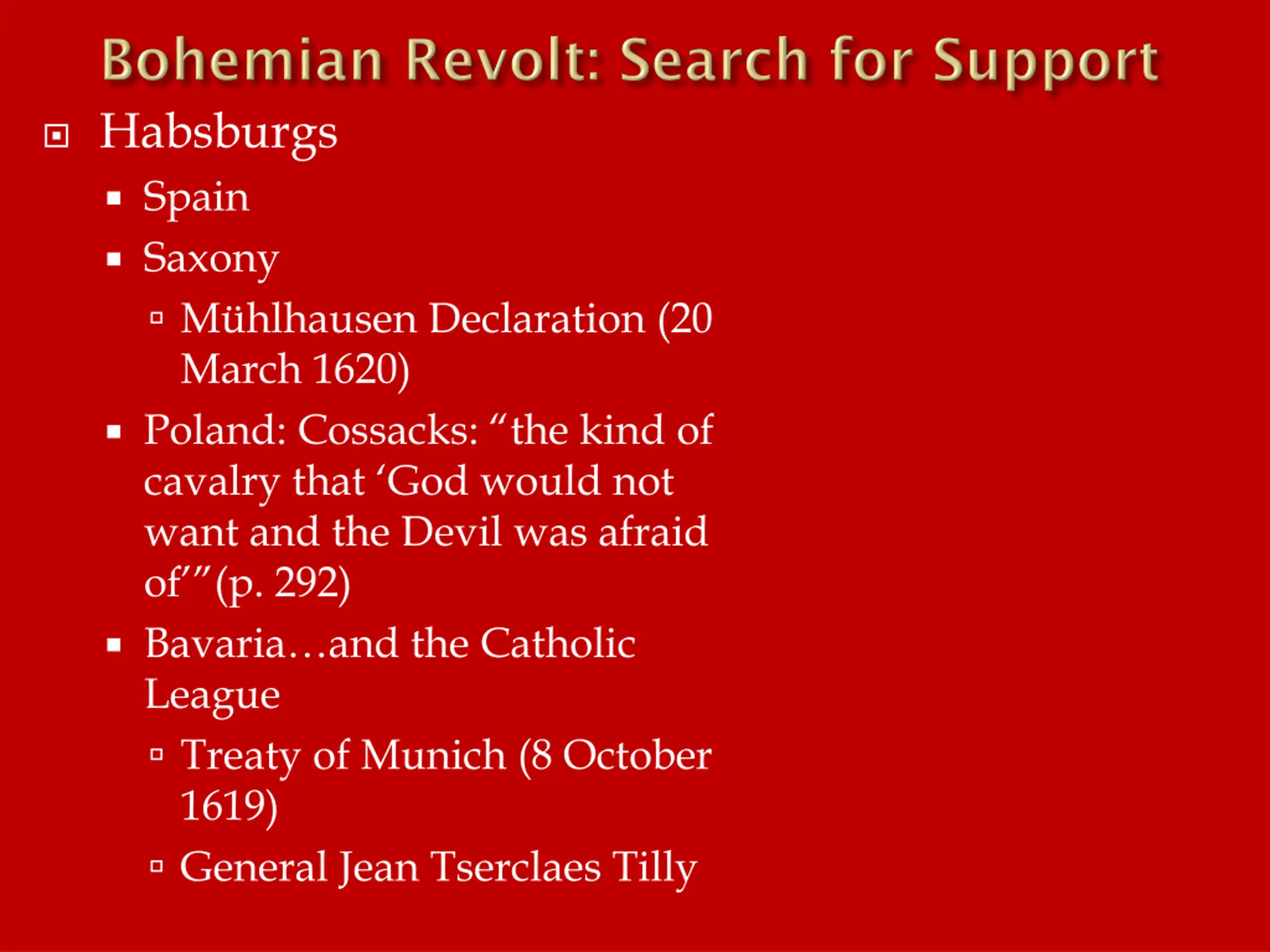 Habsburgs Spain Saxony M hlhausen Declaration (20 March 1620) Poland: Cossacks: the kind of cavalry that God would not want and the Devil was afraid of (p. 292) Bavaria and the Catholic League Treaty of Munich (8 October 1619) General Jean Tserclaes Tilly