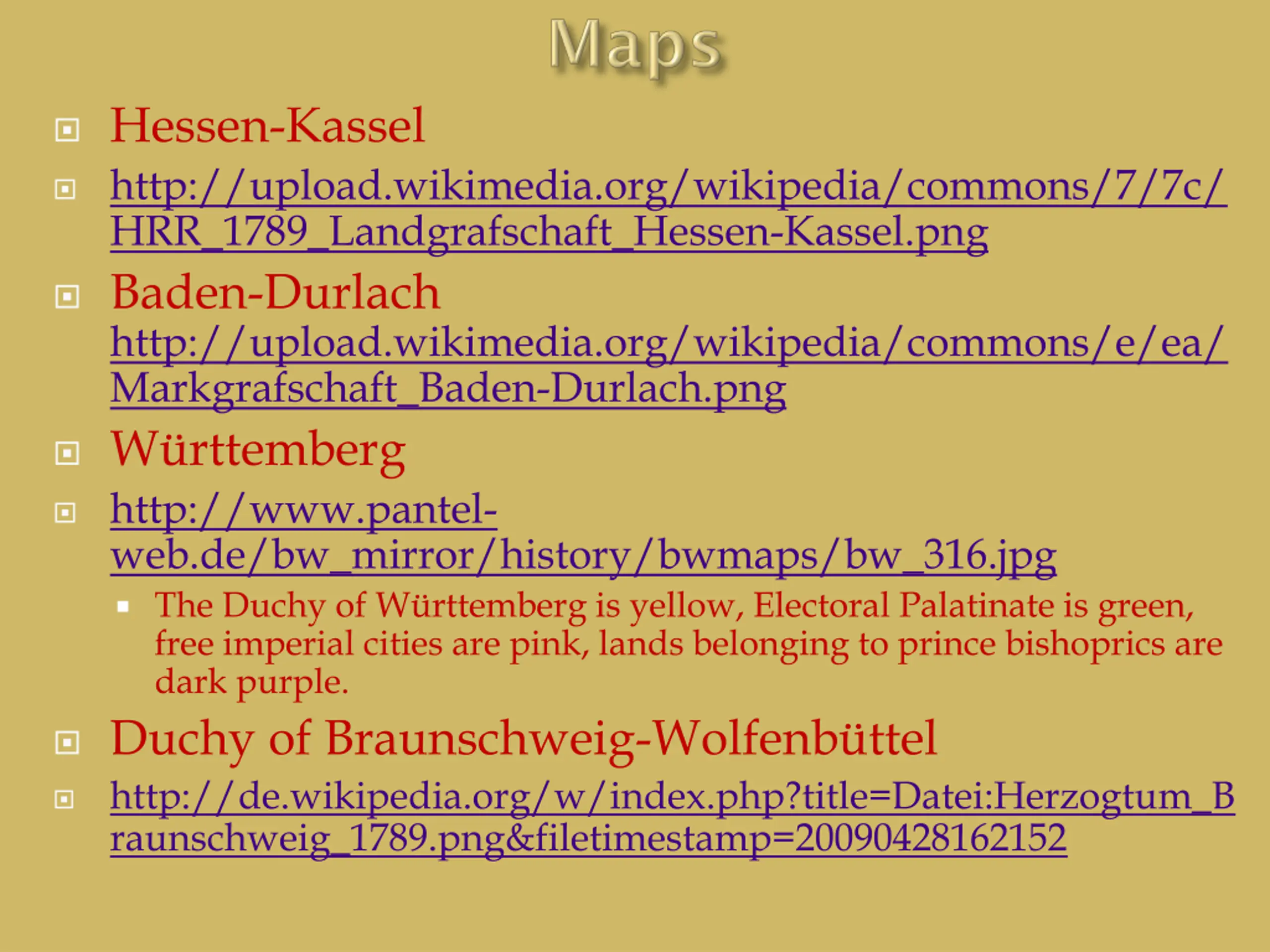 Hessen-Kassel http://upload.wikimedia.org/wikipedia/commons/7/7c/ HRR_1789_Landgrafschaft_Hessen-Kassel.png Baden-Durlach http://upload.wikimedia.org/wikipedia/commons/e/ea/ Markgrafschaft_Baden-Durlach.png W rttemberg http://www.pantel- web.de/bw_mirror/history/bwmaps/bw_316.jpg The Duchy of W rttemberg is yellow, Electoral Palatinate is green, free imperial cities are pink, lands belonging to prince bishoprics are dark purple. Duchy of Braunschweig-Wolfenb ttel http://de.wikipedia.org/w/index.php?title=Datei:Herzogtum_B raunschweig_1789.png&filetimestamp=20090428162152