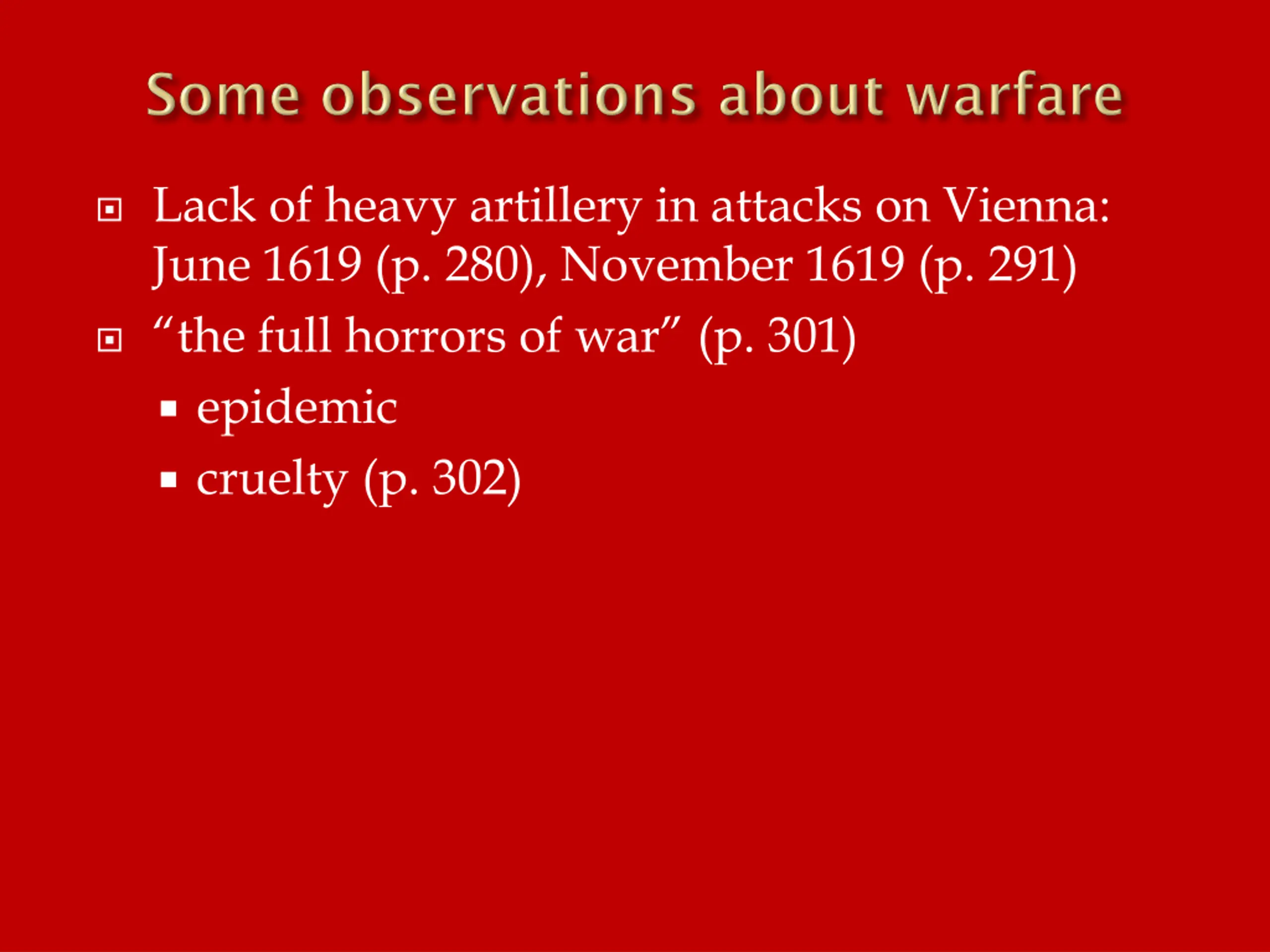 Lack of heavy artillery in attacks on Vienna: June 1619 (p. 280), November 1619 (p. 291) the full horrors of war (p. 301) epidemic cruelty (p. 302)