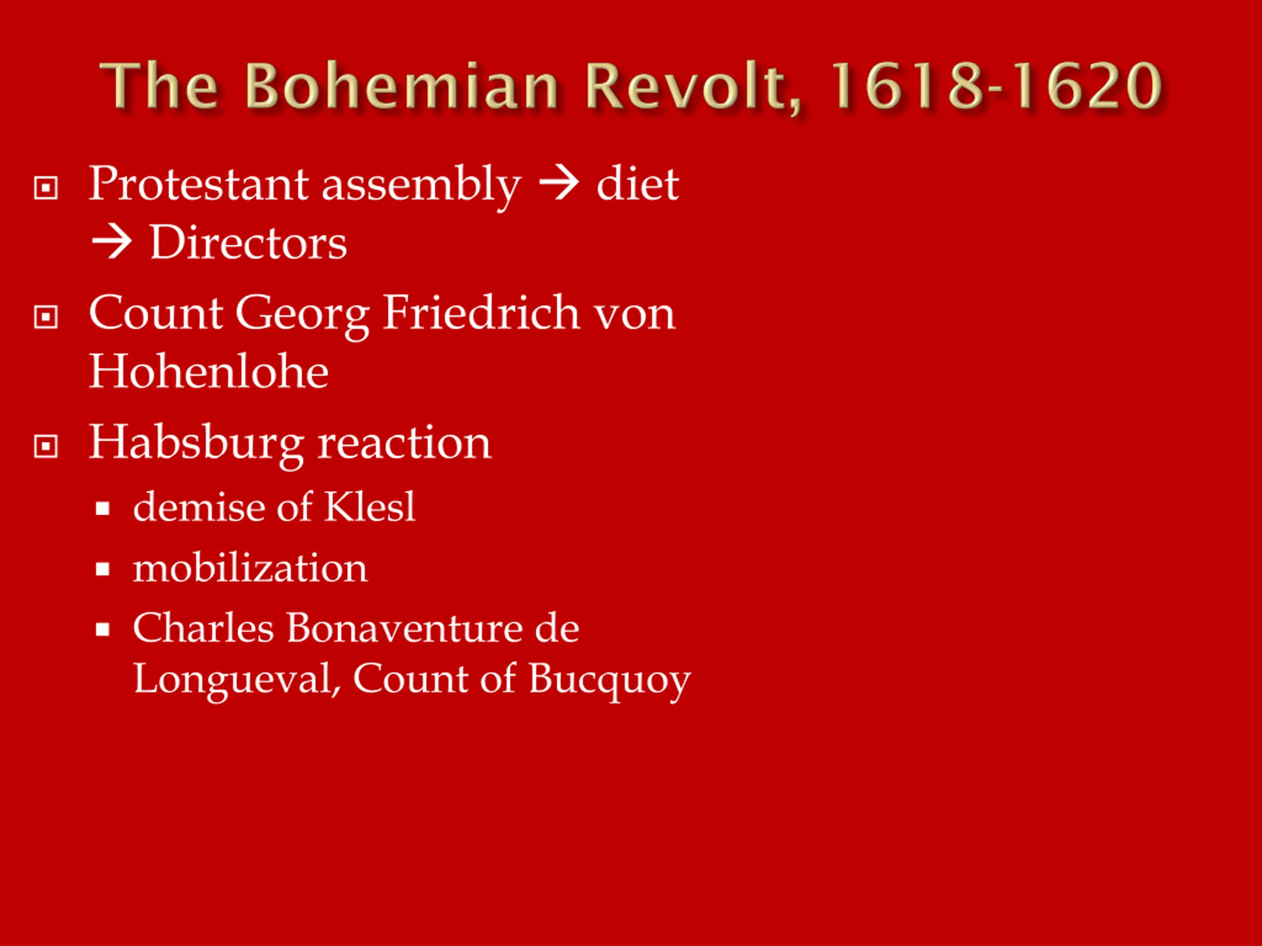 Protestant assembly diet Directors Count Georg Friedrich von Hohenlohe Habsburg reaction demise of Klesl mobilization Charles Bonaventure de Longueval, Count of Bucquoy